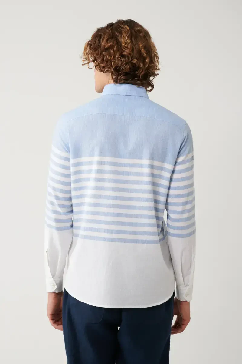Сочетая стиль и комфорт, мужская синяя рубашка с пуговицами на воротнике, панельная полосатая, приталенная A41y2190 станет незаменимой частью вашего гардероба. Предлагая потрясающий вид с его элегантным синим оттенком и тонкими полосками, рубашка идеально подходит для любого типа телосложения благодаря своему воротнику на пуговицах и приталенному крою. Изготовленная из высококачественной ткани, рубашка дышащая и прочная. Идеально подходящая для повседневного использования, эта рубашка поможет вам завершить свой стиль в любой обстановке, от деловых встреч до особых случаев.