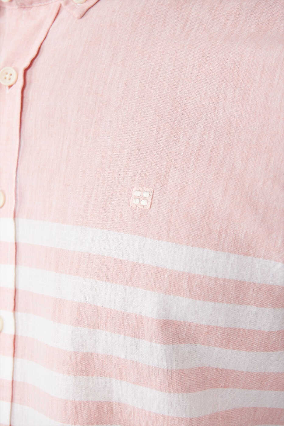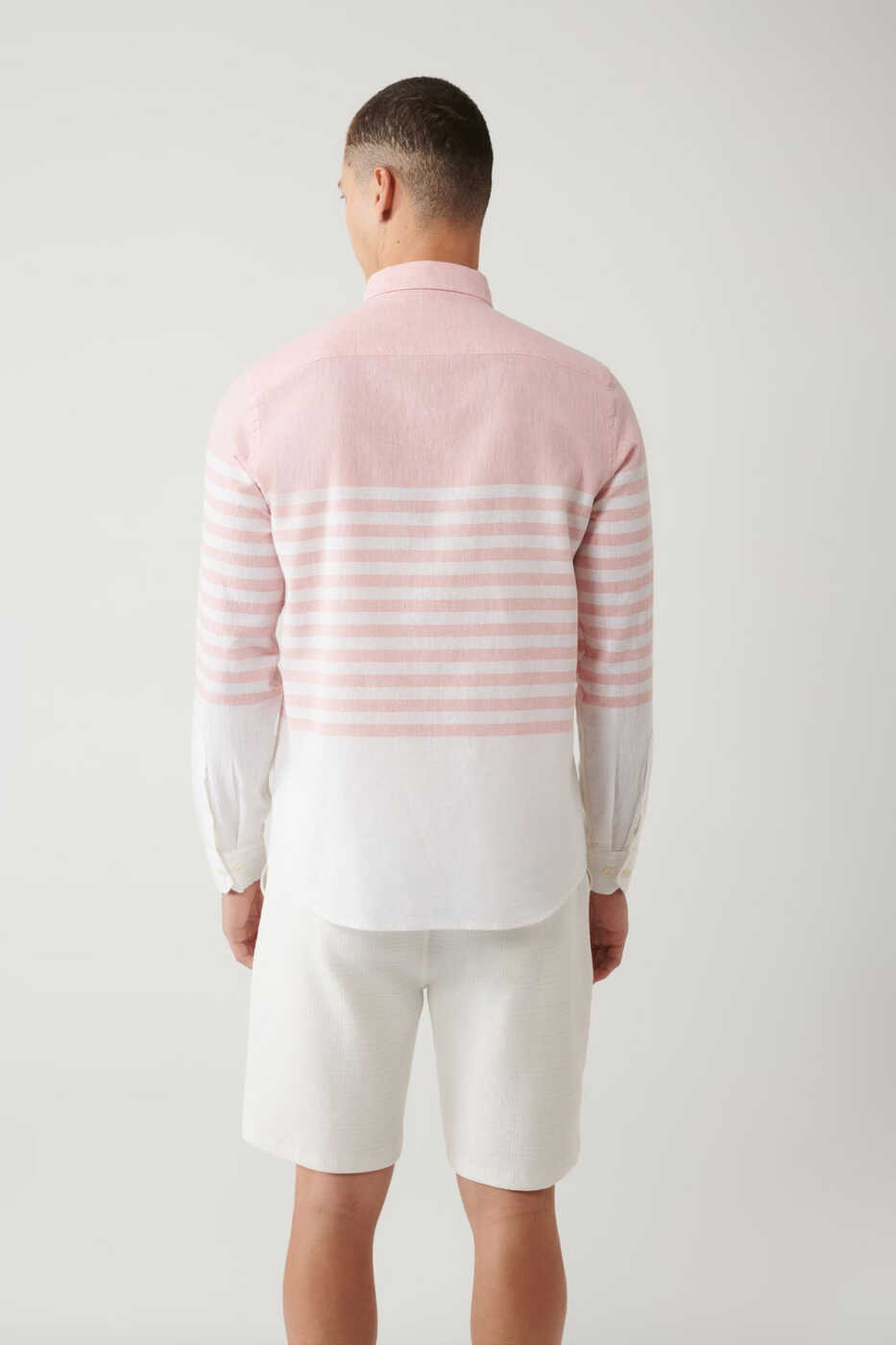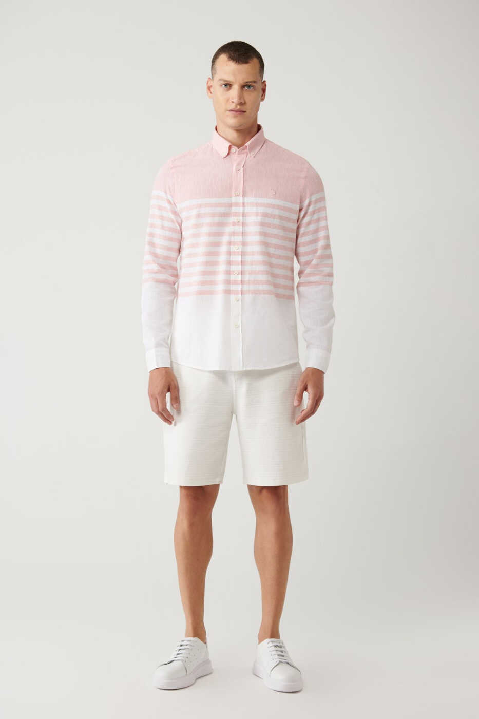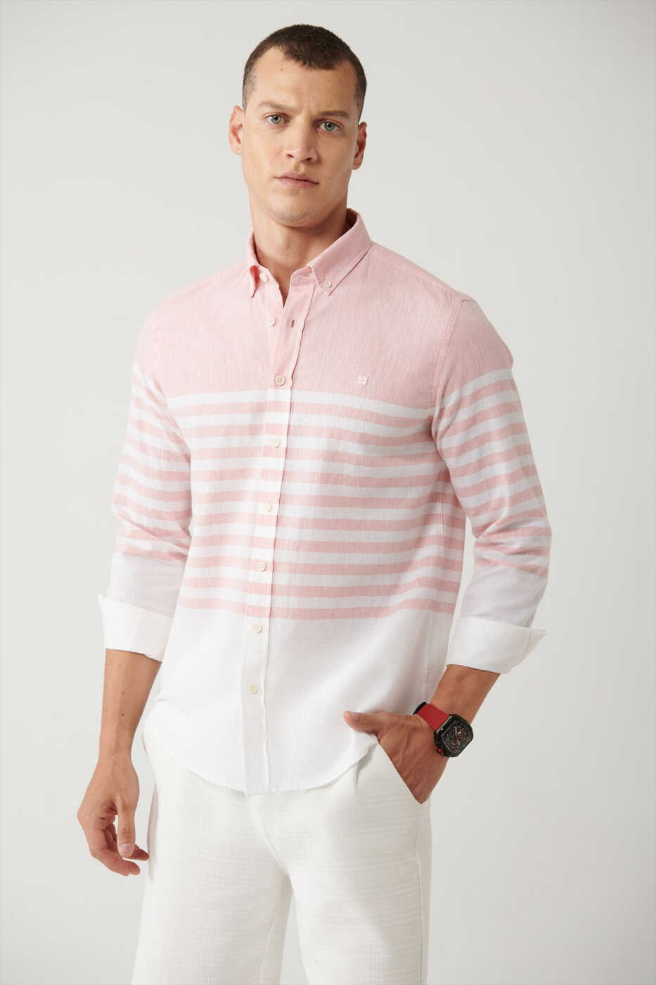 Почувствуйте стиль и комфорт вместе с Мужской светло-розовой рубашкой с пуговицами на воротнике, полосатая, приталенная, A41y2190!