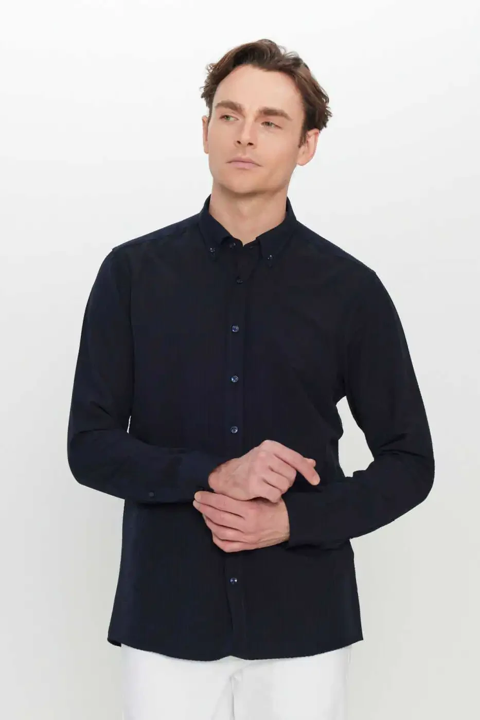 Altınyıldız Classics Erkek Lacivert Slim Fit Dar Kesim Düğmeli Yaka Armürlü Gofre Desenli Gömlek ile şıklığı ve rahatlığı bir arada yaşayın. Yaz koleksiyonunun bu gözde parçası, modern erkeğin gardırobunda mutlaka bulunması gereken bir seçenektir. Özel armürlü gofre deseni, gömleğe farklı bir boyut kazandırırken, lacivert rengi her ortama uyum sağlar. Slim fit kesimi sayesinde vücuda oturan, dar kesim tasarımı ile dinamik bir görünüm sunar. Düğmeli yakası ve uzun kollu yapısıyla hem klasik hem de spor kombinlerinizde rahatlıkla kullanabilirsiniz. Cepsiz tasarımı, gömleğin modern ve minimalist çizgisini destekler. Altınyıldız Classics Travel serisine ait bu gömlek, seyahatlerinizde de size eşlik edecek konfor ve şıklığı sunar. ACE020252171LAC ürün kodu ile kolayca bulabileceğiniz bu gömlek, %62 viskoz, %35 polyester ve %3 elastan karışımı kumaşı sayesinde gün boyu rahatlık sağlar. Kumaşın nefes alabilen yapısı, özellikle yaz aylarında terlemeyi en aza indirir. Gömleğin armürlü dokusu, kumaşa dayanıklılık ve uzun ömürlülük kazandırır. Gofre deseni ise, gömleğe hareketli ve şık bir görünüm verir. Bu özel tasarım gömlek, iş toplantılarından özel davetlere, günlük kullanımdan hafta sonu gezilerine kadar her ortamda stilinizi yansıtmanıza yardımcı olur. Altınyıldız Classics kalitesiyle üretilen bu gömlek, uzun yıllar boyunca gardırobunuzun vazgeçilmez parçası olacak. Şıklığı ve konforu bir arada arayan erkekler için ideal bir seçimdir. Gömleği, farklı renklerdeki pantolonlar ve ceketlerle kombinleyerek kendi tarzınızı yaratabilirsiniz. Aksesuar olarak şık bir saat veya kemer kullanarak kombininizi tamamlayabilirsiniz. Unutmayın, doğru kombinlerle bu gömlek, her zaman dikkat çekici ve stil sahibi görünmenizi sağlar.