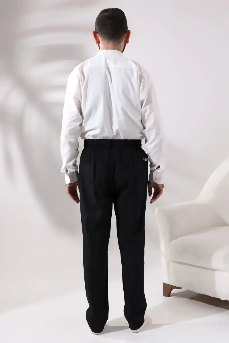 Эти черные льняные брюки - идеальный выбор для мужчин, ищущих сочетание комфорта и стиля. Брюки имеют эластичный пояс, что делает их удобными для надевания и снятия. Они также имеют свободный крой, что идеально подходит для совершения хаджа и умры.