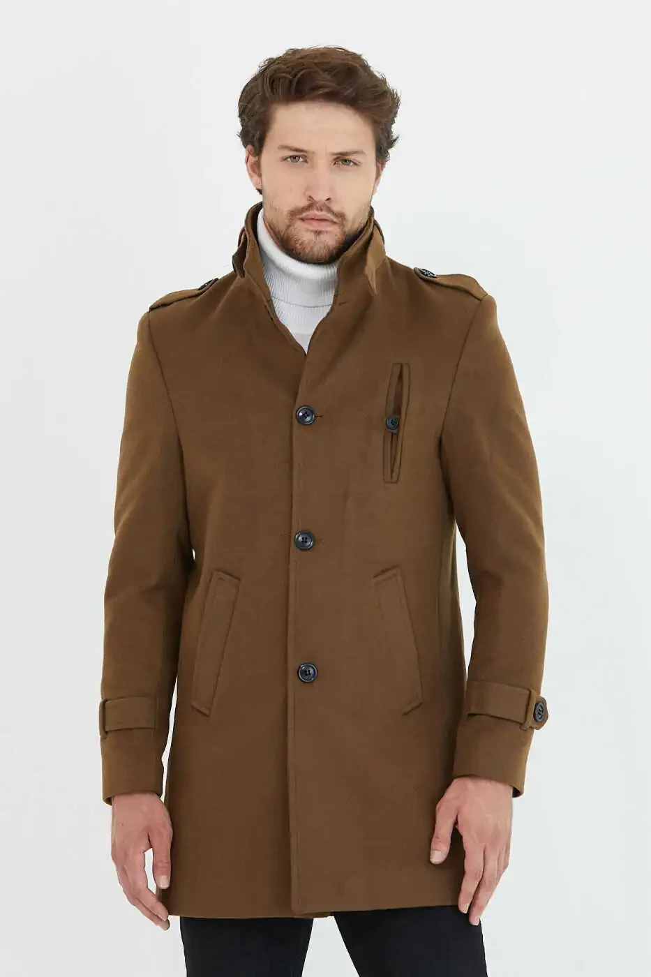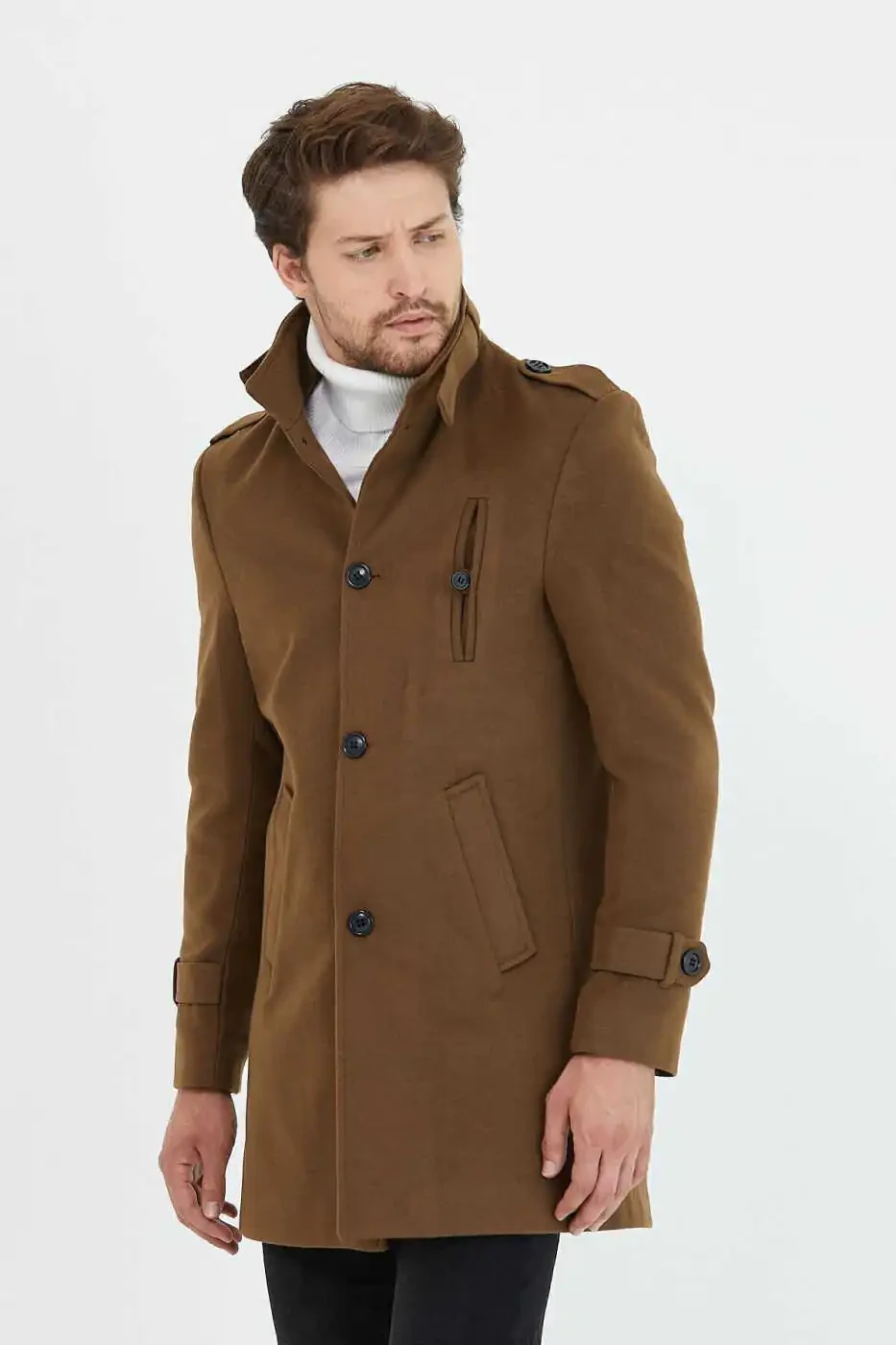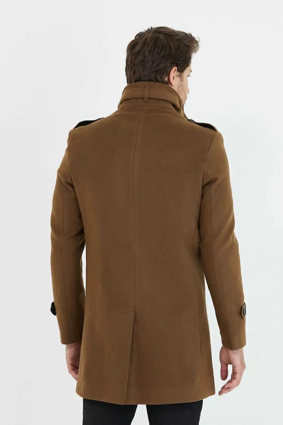 Мужское темно-коричневое длинное кашемировое пальто с отложным воротником и узким кроем, созданное для того, чтобы обеспечить вам элегантность и защиту в холодные зимние дни, сочетает в себе стиль и тепло. Изготовленное из ткани из смеси 50% шерсти и 50% полиэстера, это пальто обладает мягкой, но прочной структурой. Его узкий крой обеспечивает безупречную посадку по фигуре и придает современный вид. Отложной воротник предотвращает проникновение ветра и защищает шею от холода. Длина до колена также защищает ноги от холода.
