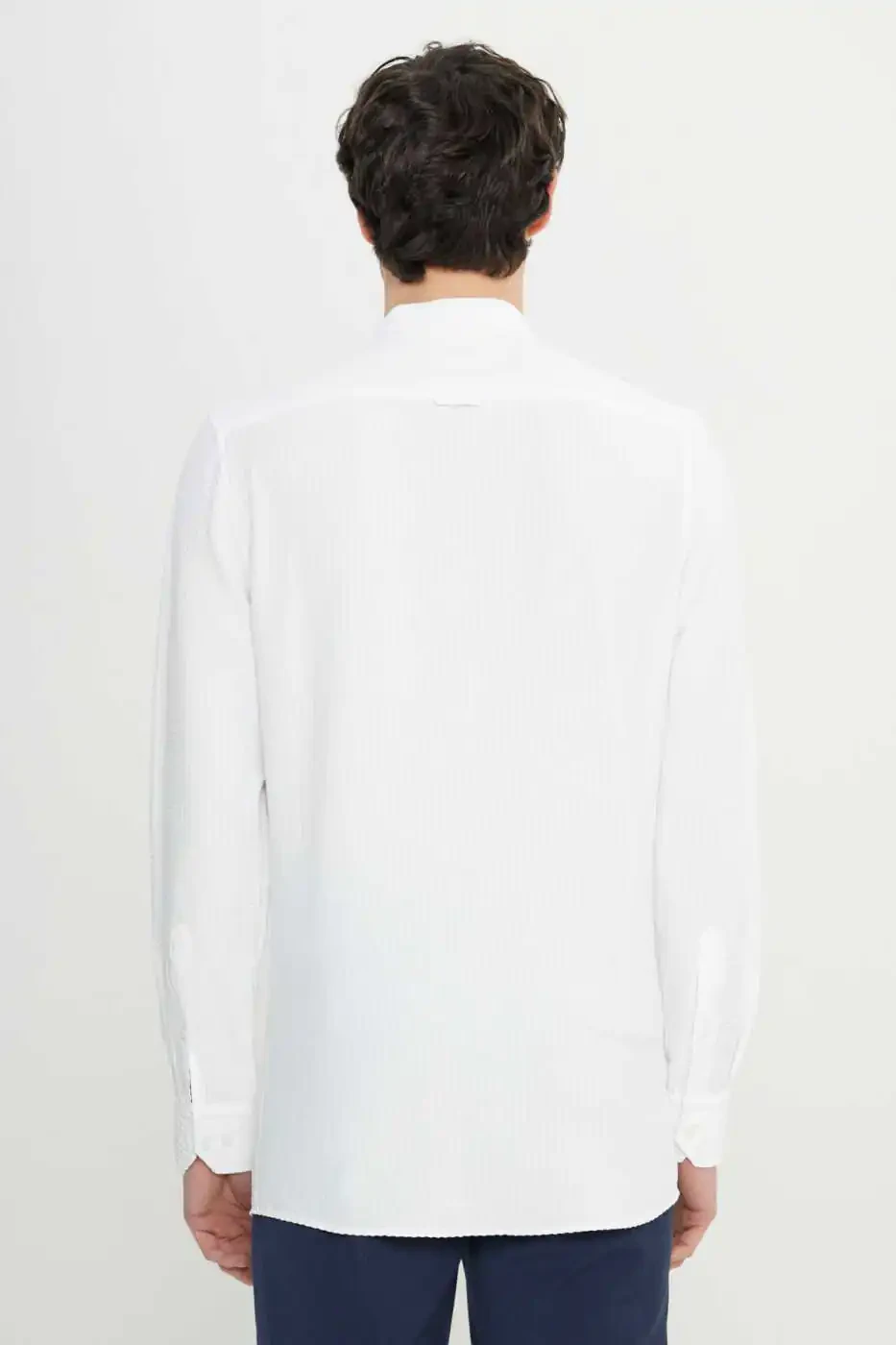 Мужская белая рубашка Slim Fit, зауженного кроя, с воротником на пуговицах и жаккардовым узором – это современный и стильный вариант, который обязательно должен быть в гардеробе у стильного мужчины. Эта рубашка имеет привлекательный внешний вид благодаря ткани, изготовленной по специальной технике жаккардового переплетения, и обеспечивает комфортное использование в течение всего дня. Крой Slim fit, облегающий фигуру, помогает создать подтянутый вид, а зауженный крой создает современный и модный силуэт. Белый цвет идеально подходит для любого образа и легко сочетается с разными цветами. Эта рубашка, которая дополнит ваш шик как в повседневной жизни, так и на особых мероприятиях, станет одной из незаменимых вещей в вашем гардеробе. Деталь с воротником на пуговицах придает рубашке классический вид, позволяя персонализировать свой стиль, сочетая ее с разными галстуками и бабочками. Уникальная текстура жаккардовой ткани придает рубашке изысканность и выделяет ее среди других однотонных рубашек. Эта рубашка, изготовленная из качественной ткани, обеспечивает длительный срок службы, легко гладится после стирки и сохраняет свою первоначальную форму. Мужская белая рубашка Slim Fit, зауженного кроя, с воротником на пуговицах и жаккардовым узором – идеальный выбор для мужчин, которые хотят быть одновременно стильными и удобными, и является одним из самых эффективных способов отразить свой стиль. Вы можете создать официальный образ, сочетая рубашку с классическим костюмом, или создать более непринужденный и повседневный стиль, сочетая ее с джинсами и кроссовками. В любом случае, эта рубашка, которая обеспечит вам комфортный день без ущерба для вашего стиля, является кандидатом на то, чтобы стать одной из самых популярных вещей в вашем гардеробе. Кроме того, вневременная элегантность белого цвета позволяет с комфортом носить эту рубашку в любое время года. Вы можете получить стильный вид летом самостоятельно, а зимой – в куртках или свитерах. Дышащая структура ткани предотвращает потоотделение и позволяет вам оставаться свежим в течение всего дня. Эту рубашку можно с комфортом использовать в любой обстановке, от деловых встреч до ужинов, от особых мероприятий до повседневных мероприятий, она сочетает в себе стиль и комфорт. Подчеркните свой стиль с помощью мужской белой рубашки Slim Fit, зауженного кроя, с воротником на пуговицах и жаккардовым узором и привлекайте внимание в любой обстановке.