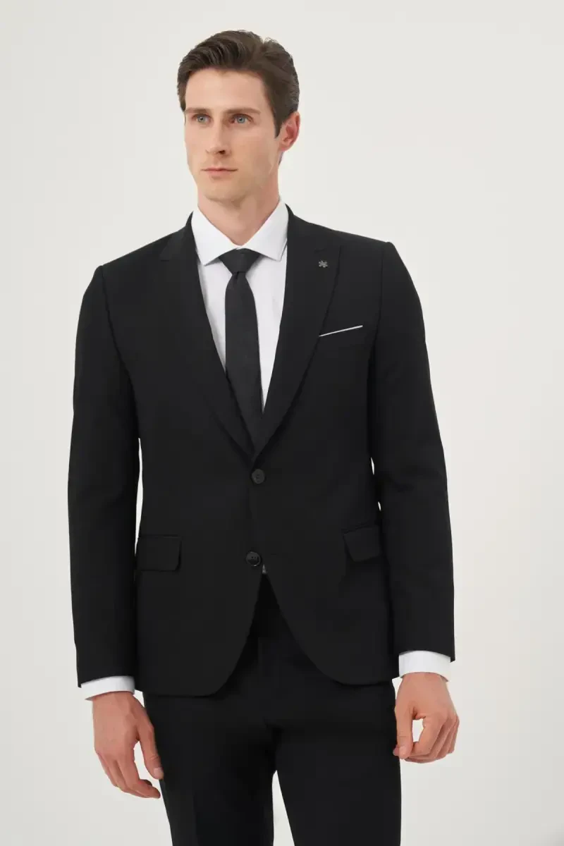 Мужской черный классический однотонный приталенный узкий костюм-двойка 6 Drop имеет вневременной дизайн, отражающий стиль современного мужчины. Независимо от того, надеваете ли вы его на деловую встречу или на званый ужин, этот костюм подчеркнет вашу элегантность в любой обстановке. Приталенный крой подчеркивает вашу фигуру, помогая вам создать более динамичный и стройный силуэт. Этот костюм, сочетающий в себе благородство черного цвета и минималистичный шик однотонного дизайна, легко сочетается с разными рубашками и галстуками, позволяя вам свободно выражать свой личный стиль.Ткань костюма специально подобрана для вашего комфорта в течение всего дня. Его дышащая структура предотвращает потоотделение и позволяет вашей коже дышать. Таким образом, вы всегда будете чувствовать себя свежо, даже если будете в костюме долгие часы. Кроме того, ткань устойчива к образованию складок, благодаря чему ваш костюм всегда будет выглядеть отутюженным и ухоженным. Это свойство является большим преимуществом, особенно для мужчин с напряженным графиком работы и для тех, кто часто путешествует.Покрой костюма 6 Drop обеспечивает идеально пропорциональный внешний вид. Гармония между пиджаком и брюками помогает вашей фигуре выглядеть более сбалансированной и пропорциональной. Зауженные брюки делают ваши ноги более длинными и стройными, а пиджак подчеркивает ширину ваших плеч, создавая мужественный образ.Этот костюм отличается не только элегантностью, но и простотой в использовании. Во внутренние и внешние карманы пиджака можно безопасно положить личные вещи, такие как телефон, кошелек и ключи. Карманы брюк также удобны и практичны.Мужской черный классический однотонный приталенный узкий костюм-двойка 6 Drop станет одним из самых ценных предметов вашего гардероба и всегда будет дарить вам уверенную элегантность. Независимо от того, предпочитаете ли вы классический или современный стиль, в этом костюме вы всегда будете выглядеть безупречно.