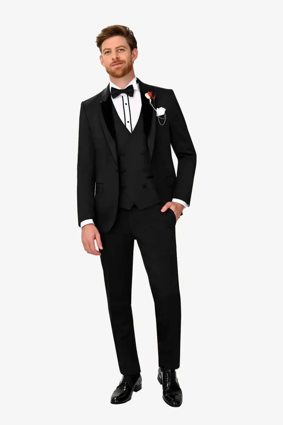 Создайте потрясающий стиль на своей свадьбе с помощью мужского черного смокинга с воротником-шалью, украшенного камнями, и проведите незабываемый день!