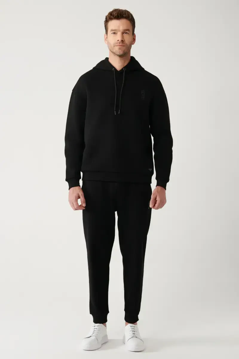 Мужской черный свитшот с капюшоном и гофрированной печатью, с начесом, 3-х ниточный, свободный крой A32y1190, созданный, чтобы добавить современный штрих к вашему повседневному стилю, является незаменимой вещью в гардеробе каждого мужчины. Его мягкая и комфортная текстура обеспечивает комфорт в течение всего дня, а стильный дизайн подойдет для любой обстановки.