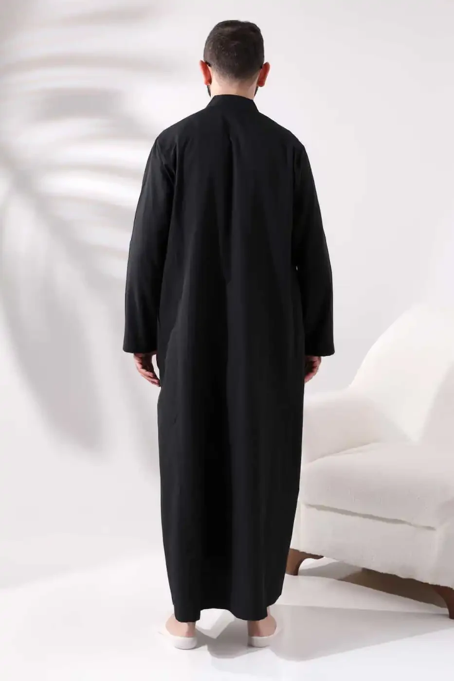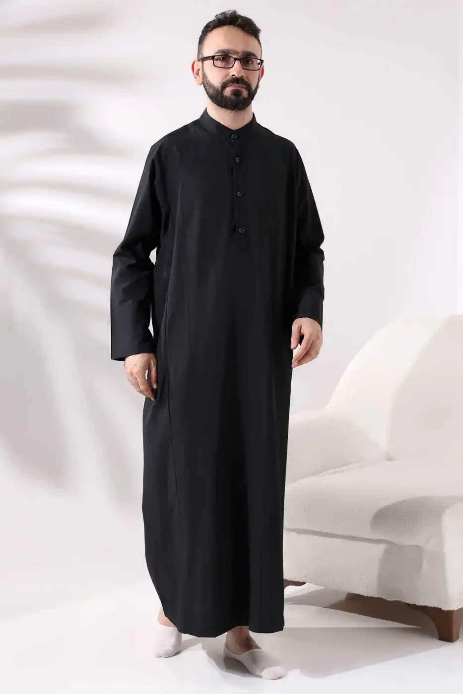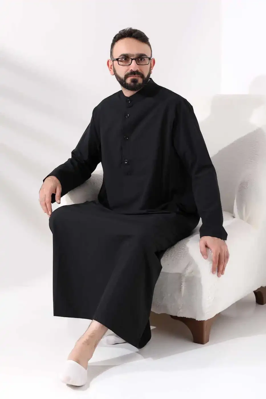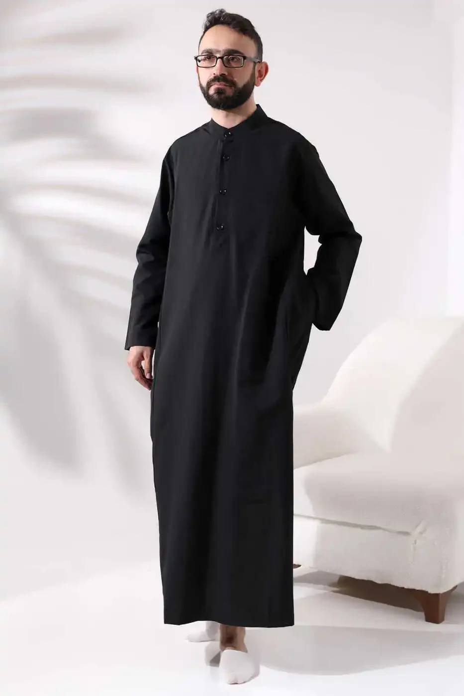 Длинный черный мужской энтерий для хаджа и умры — это воплощение комфорта и элегантности для особых случаев и на каждый день. Его можно носить во время религиозных обрядов и в повседневной жизни, так как он выполнен из хлопка с вискозой и имеет свободный крой. Ткань, которая не прилегает к телу, гарантирует удобство на протяжении всего дня.