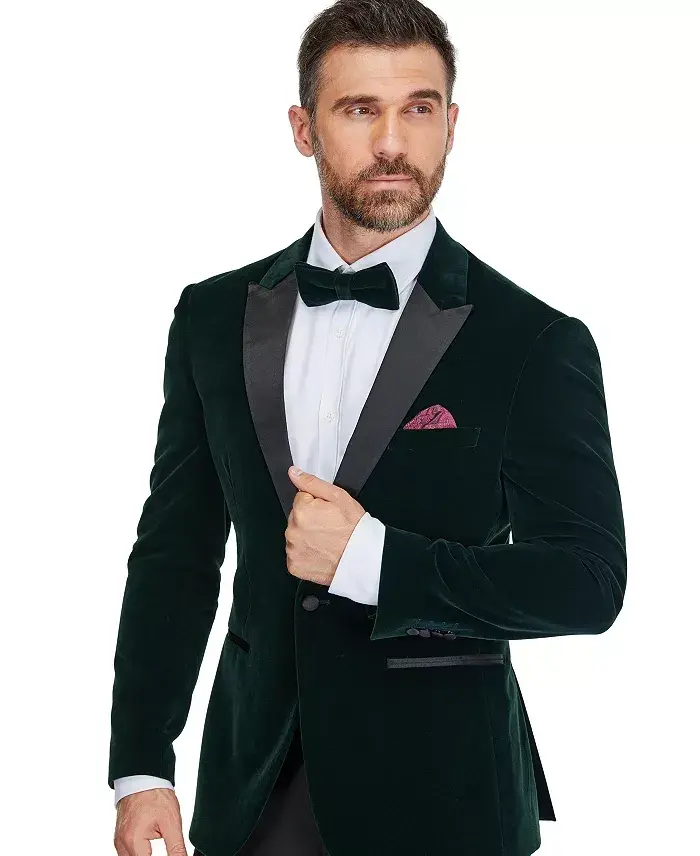 Мужской двубортный бархатный смокинг с лацканами "птичий глаз" и узкой посадкой, созданный для того, чтобы произвести эффектное впечатление и выделиться на особых мероприятиях, сочетает в себе изысканный стиль и комфорт. Этот костюм, вдохновленный европейской модой, идеально подходит для стройных и высоких фигур. Роскошный бархатный пиджак привлекает внимание элегантными лацканами с рисунком "птичий глаз" и удобными карманами. Брюки из эластичной ткани обеспечивают свободу движений, а их прямой крой без отворотов позволяет выполнить индивидуальную подгонку по фигуре. Этот костюм, который станет идеальным дополнением вашего образа на любом торжественном мероприятии, от грандиозных приемов до свадеб, благодаря своему вневременному дизайну станет незаменимым предметом вашего гардероба. Для завершения образа в комплект входит бархатная бабочка в тон костюму. Ткань Performance Sport Stretch обеспечивает превосходную свободу движений и комфорт, не жертвуя при этом элегантным внешним видом. Изысканные детали отделки, такие как лацканы "птичий глаз", застежка на две пуговицы, нагрудный карман для платка, две шлицы сзади и манжеты с четырьмя пуговицами, делают этот костюм уникальным. Два боковых и два задних кармана брюк обеспечивают практичность, а отсутствие отворотов позволяет подогнать длину брюк по вашему росту. Этот костюм, изготовленный из тщательно подобранной смеси 63% полиэстера, 35% вискозы и 2% спандекса для обеспечения прочности и комфорта, требует сухой чистки для длительного использования. Для идеальной посадки мы рекомендуем вам измерить обхват груди и выбрать размер в соответствии с таблицей размеров. Размер груди 38 соответствует размеру костюма 38. Размер талии брюк на 6 дюймов меньше размера пиджака. Выберите длину брюк в соответствии с вашим ростом: S: 162 см - 170 см, R: 172 см - 183 см, L: 183 см - 188 см. Создавайте незабываемые моменты с мужским двубортным бархатным смокингом с лацканами "птичий глаз" и узкой посадкой, который подчеркнет вашу элегантность и обеспечит максимальный комфорт в ваши особенные дни.