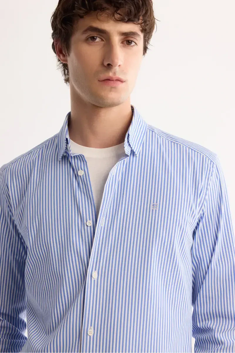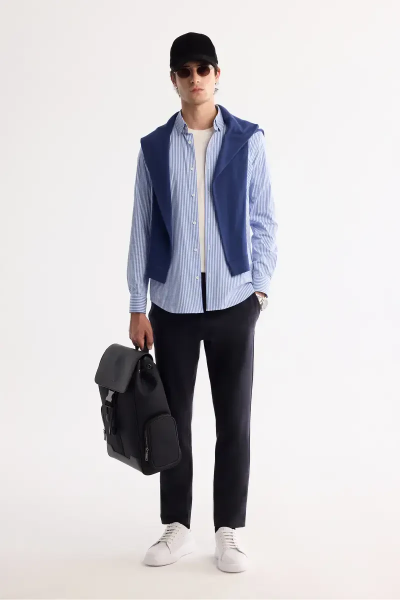 Мужская голубая рубашка с воротником на пуговицах, легко гладится, имеет специальный дизайн, сочетающий в себе элегантность и комфорт, и станет одним из основных элементов гардероба современного мужчины. Эта рубашка — идеальный выбор для тех, кто стремится к комфорту в течение дня и безупречному внешнему виду. Деталь воротника на пуговицах придает рубашке изысканный вид, а легко гладящаяся ткань обеспечивает ухоженный и аккуратный вид. Спокойный и уверенный тон синего цвета легко адаптируется к различным стилям и сочетаниям. Позволяет отразить свой стиль в любой среде, от деловых встреч до особых случаев, от повседневного использования до поездок на выходные. Крой рубашки облегает тело, но не ограничивает свободу движений. Таким образом, он создает элегантный силуэт и обеспечивает комфорт в течение дня. Качественная ткань обеспечивает длительный срок службы, а дышащая структура предотвращает потоотделение и обеспечивает ощущение свежести в течение дня. Мужская голубая рубашка с воротником на пуговицах, легко гладится — это не просто предмет одежды, это способ выразить свой стиль. С этой рубашкой, которая станет незаменимой вещью в вашем гардеробе, вы всегда будете выглядеть стильно и ухоженно, повышая свою уверенность в себе. Ткань мягко соприкасается с вашей кожей, а современный крой рубашки наилучшим образом подчеркивает линии вашей фигуры. Эта рубашка имеет вневременной дизайн и станет фаворитом стильных мужчин. Вы можете создавать разные стили, сочетая ее как с классическими брюками, так и со спортивными джинсами. Вы также можете персонализировать свою рубашку, выбрав аксессуары и создавая наряды, отражающие ваш личный стиль. Мужская голубая рубашка с воротником на пуговицах, легко гладится — идеальный выбор для мужчин, которые ищут элегантность и комфорт в одном флаконе.