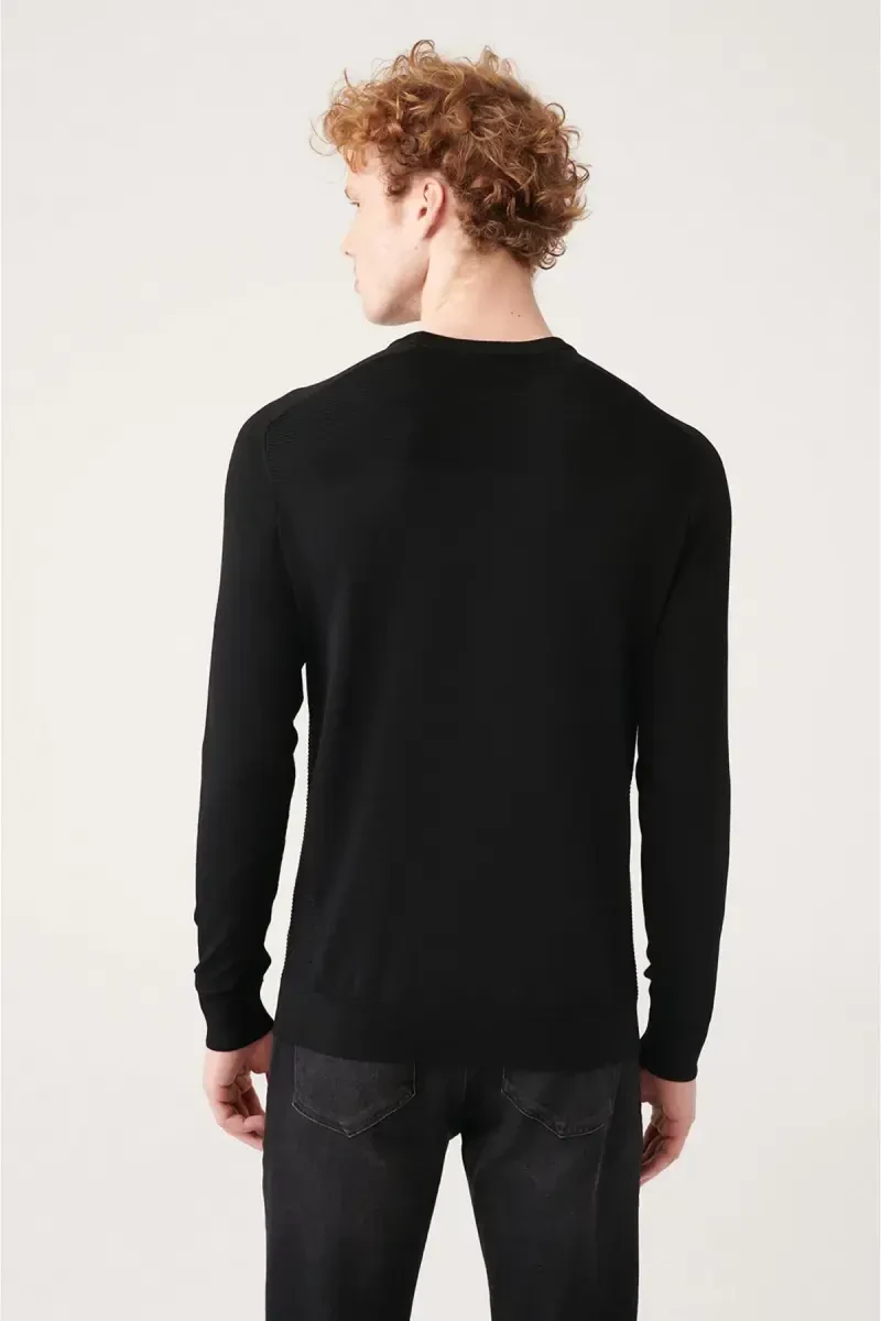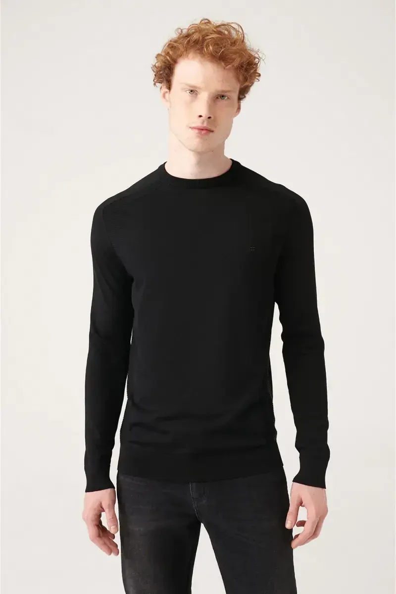 Мужской черный трикотаж с круглым вырезом, жаккардовый, узкий крой, Slim Fit A31y5004 идеально подходит для повседневного использования. Вы можете сочетать его с брюками, джинсами или шортами и дополнить кроссовками или классическими туфлями. Этот трикотаж станет отличным выбором для завершения вашего стиля для особых случаев.
