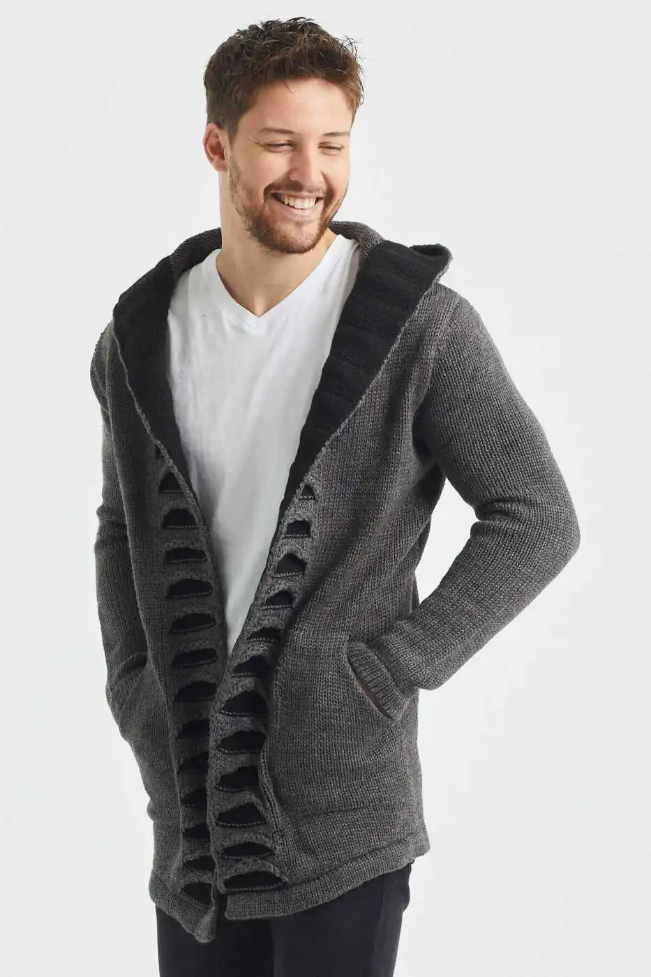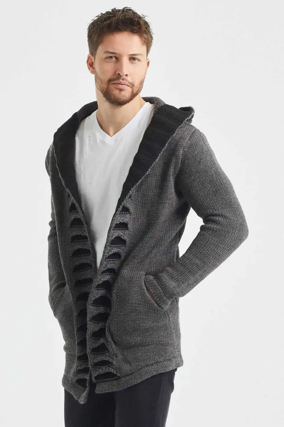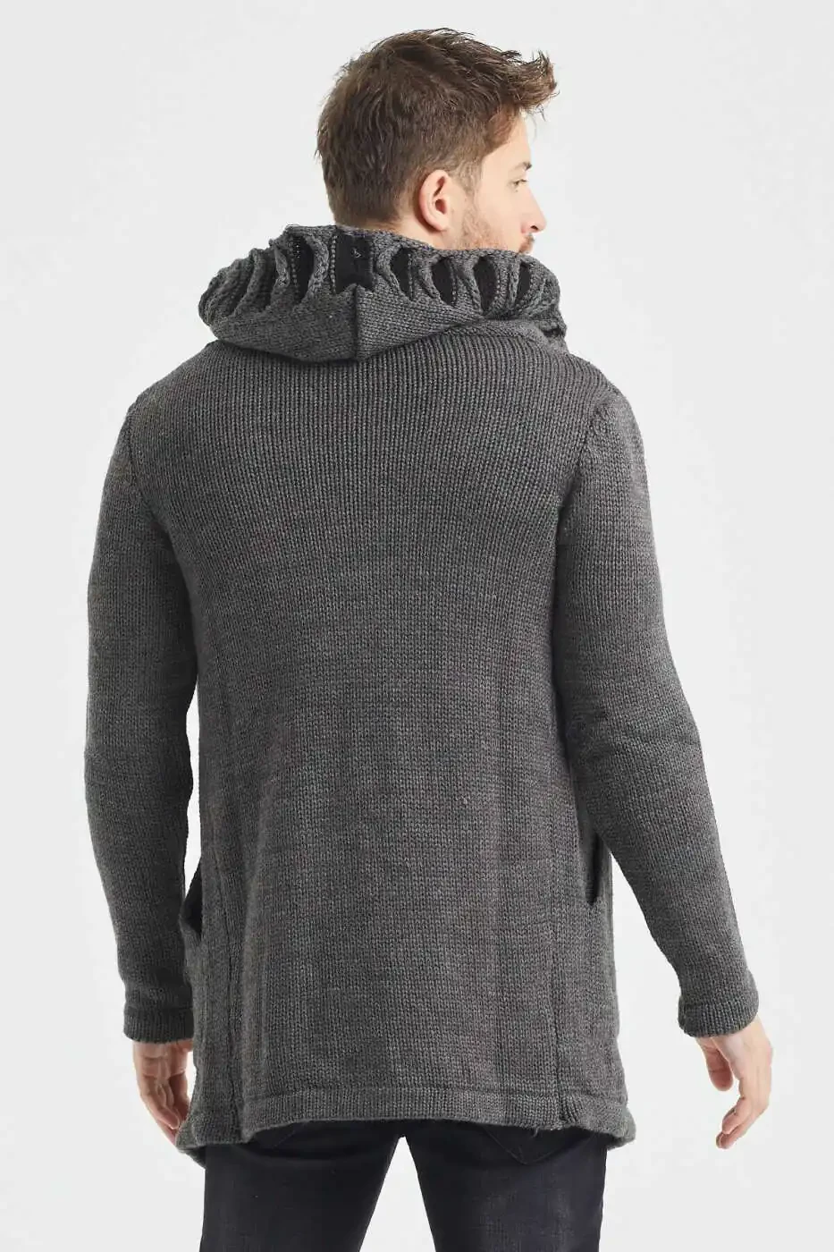 Идеальный выбор для тех, кто хочет выглядеть тепло и стильно в холодные зимние дни, мужской трикотажный кардиган-пончо с узором цвета антрацита - универсальная вещь, которую можно сочетать с различными комбинациями. Вы можете сочетать его с джинсами, чинос или кожаными брюками, чтобы создать стильный образ.