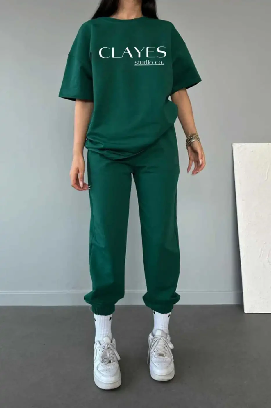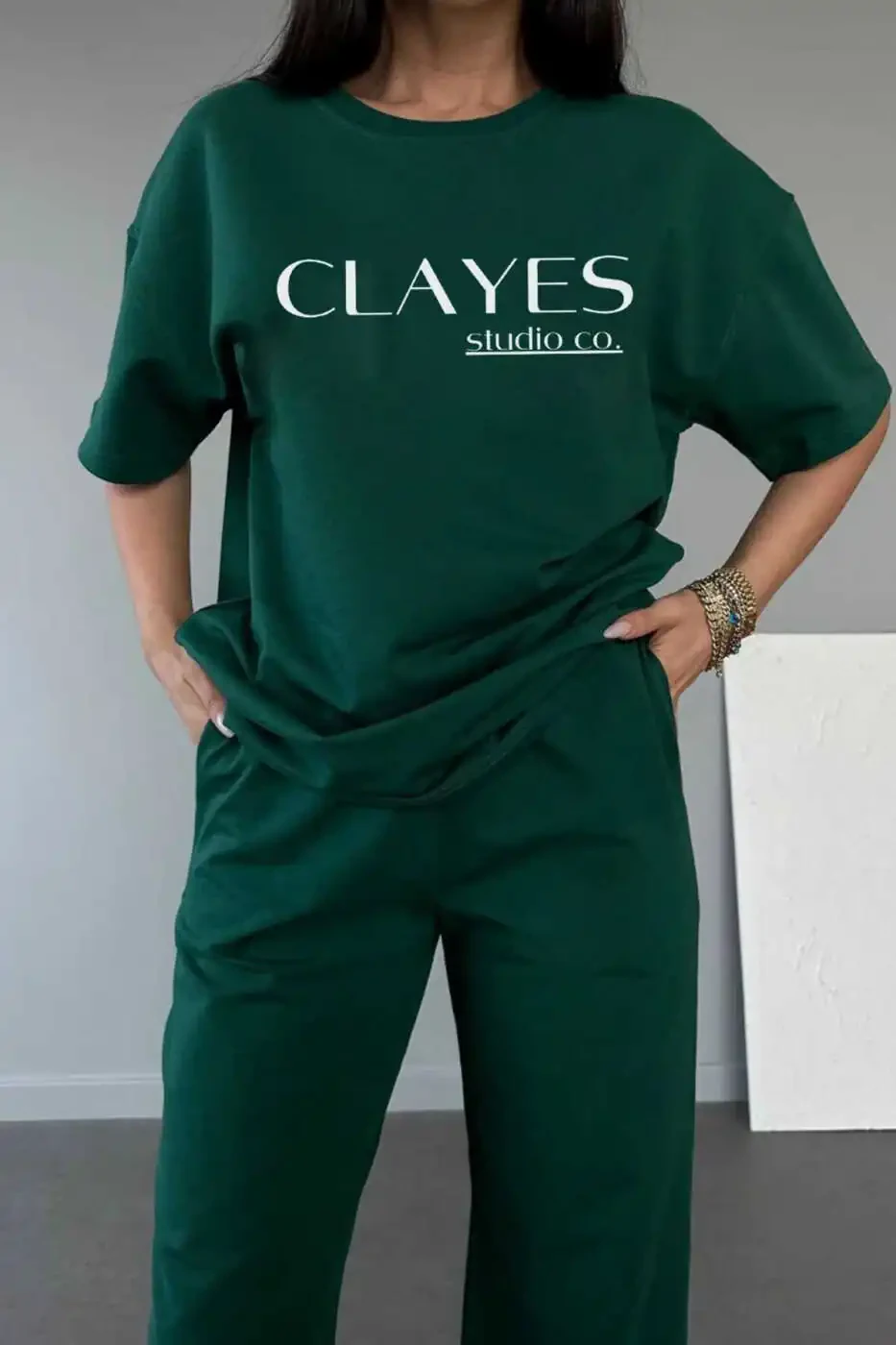 Этот комплект из футболки и спортивных штанов оливково-зеленого цвета, отражающий уникальный стиль Studio Co, сочетает в себе комфорт и элегантность. Футболка оверсайз с круглой горловиной - идеальный выбор для повседневной носки. Спортивные штаны изготовлены из мягкой и дышащей ткани, обеспечивая максимальный комфорт.