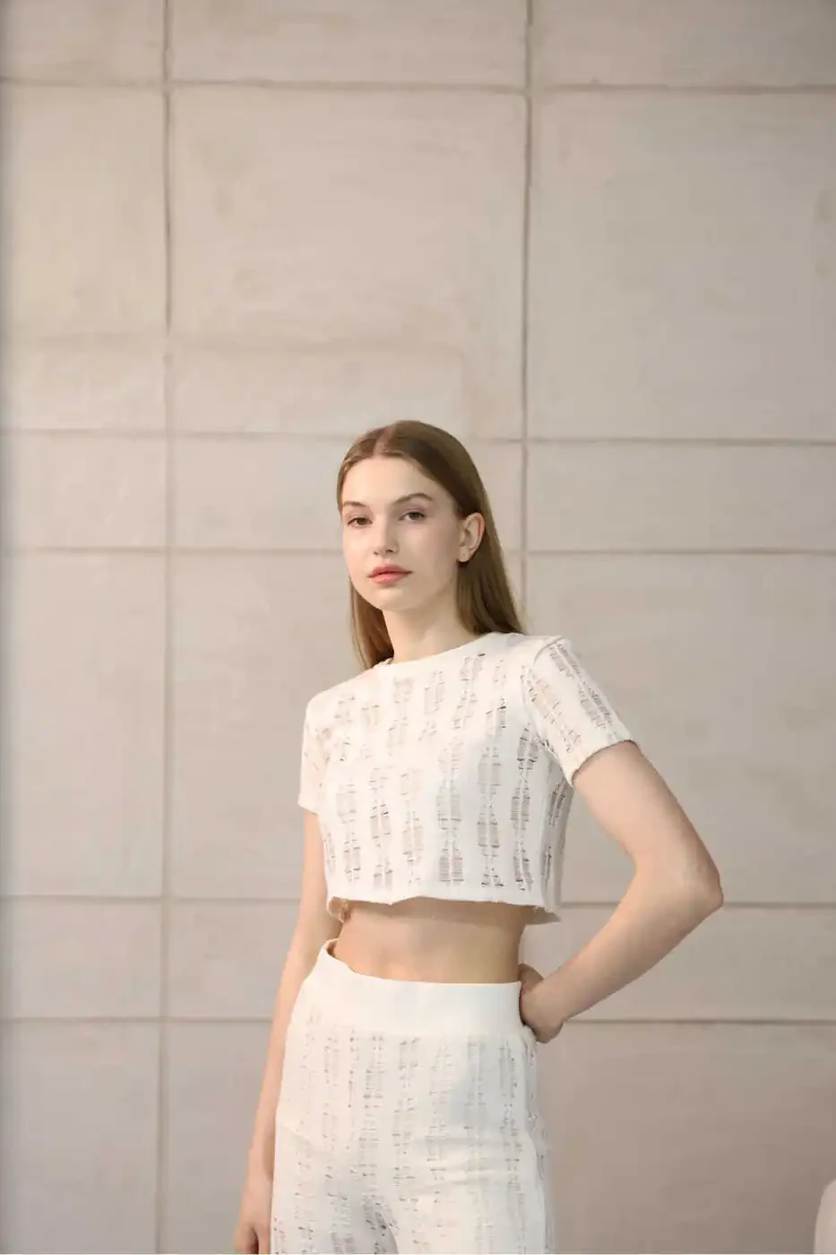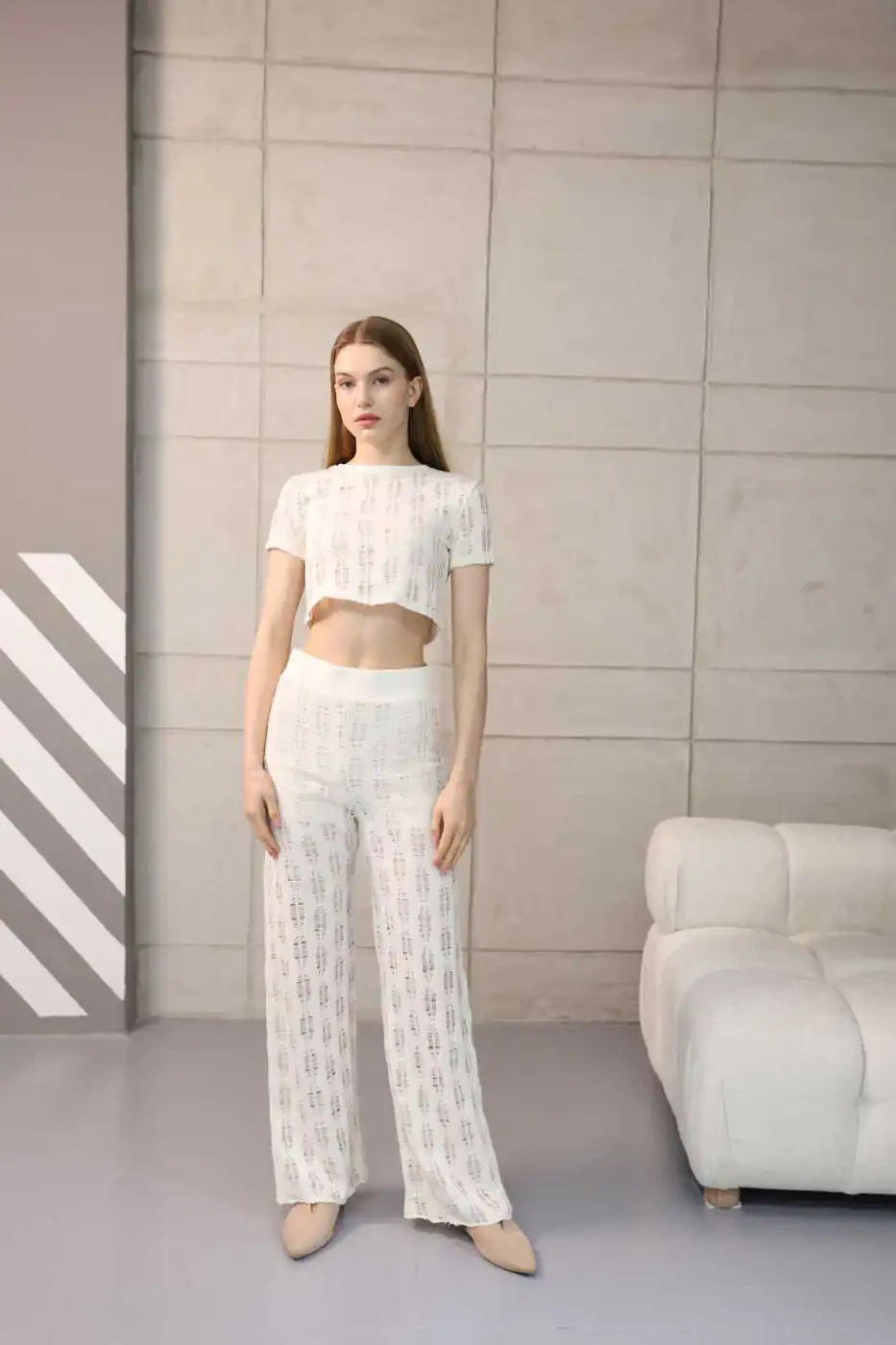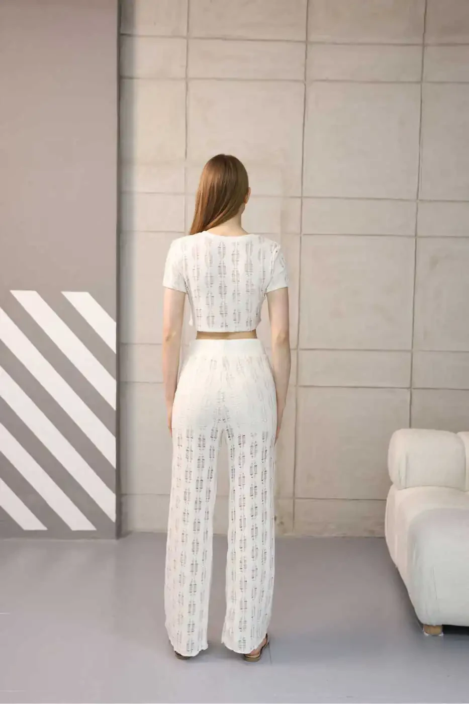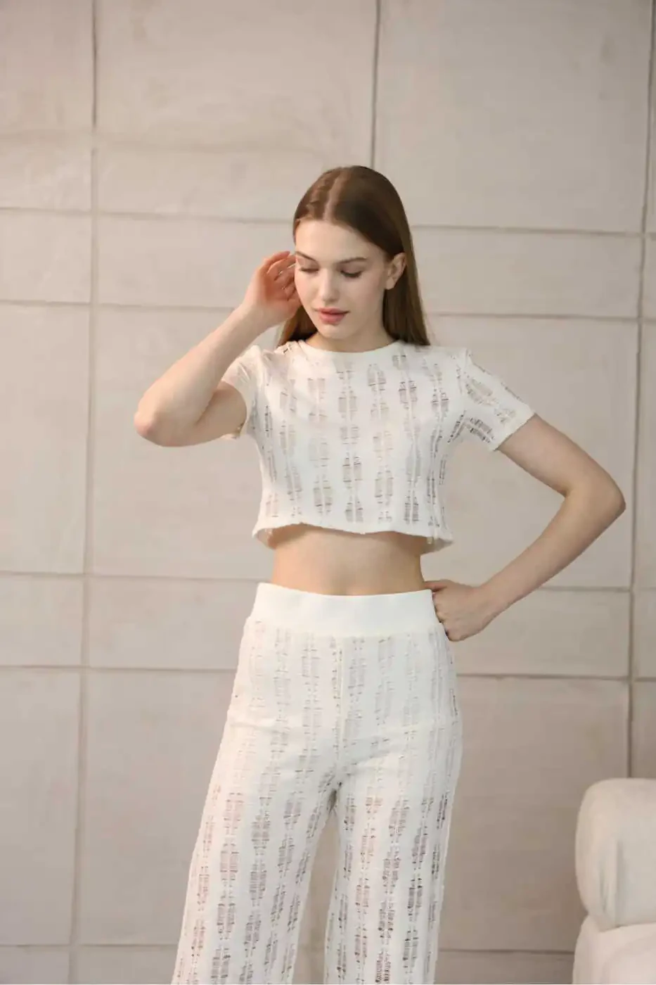 Бежевый кружевной топ и брюки с короткими рукавами - идеальный выбор для женщин, которые хотят выглядеть стильно и комфортно в жаркие летние дни. Закажите сейчас и добавьте новое измерение своему стилю!