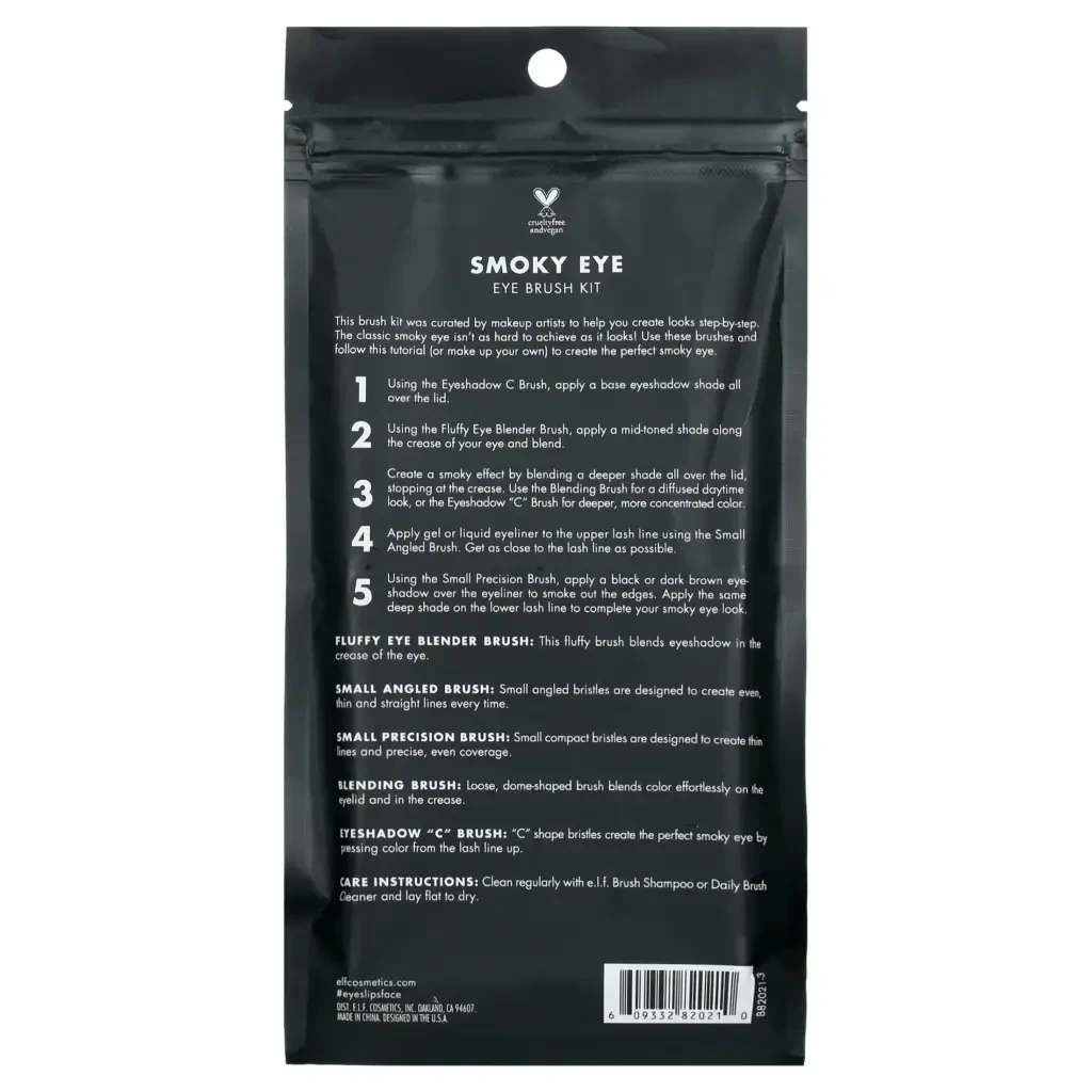 e.l.f. Cosmetics известен во всем мире как бренд, который не тестирует свою продукцию на животных и предлагает веганские продукты. Этот набор кистей также произведен в соответствии с этими принципами. Благодаря стильному и компактному дизайну, вы можете брать его с собой в поездки. Вы можете обеспечить долговечность своих кистей, регулярно очищая их. Мойте кисти теплой водой с мягким мылом и оставляйте их сушиться. e.l.f. Smoky Eye Brush Kit - отличный выбор для тех, кто ищет качественный набор кистей для макияжа по доступной цене. Идеальный подарок для себя или своих близких.