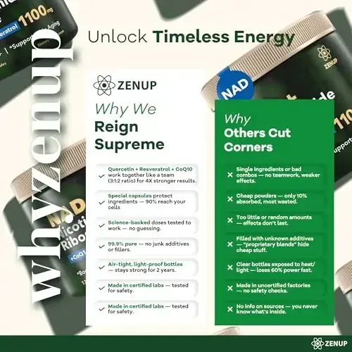 NAD+ supplement, anti-aging, cellular energy, mental focus, nicotinamide riboside, resveratrol, quercetin, liposomal, antioxidant, DNA repair