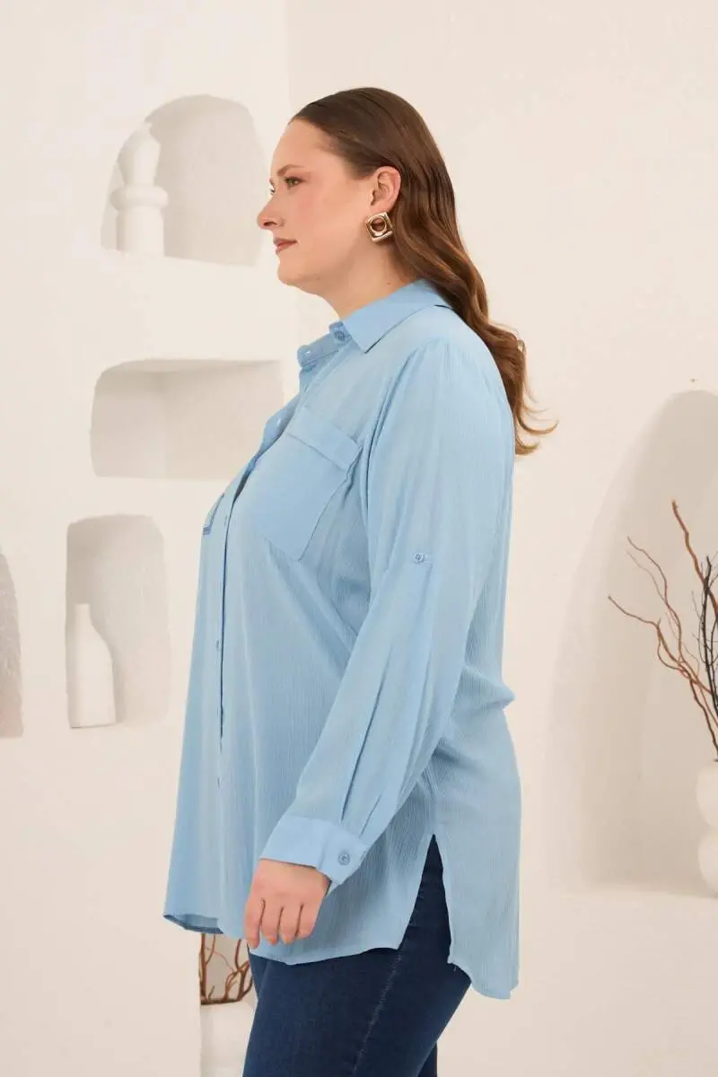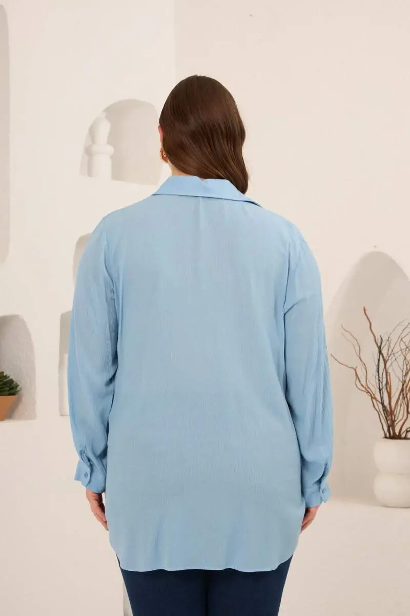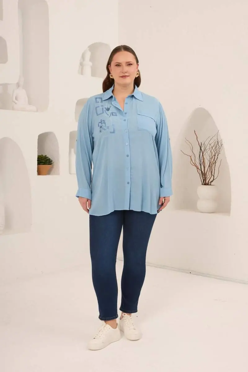 Nakış Detaylı Yanları Yırtmaçlı Büyük Beden Gömlek Bebe Mavi