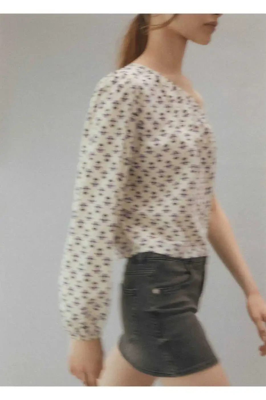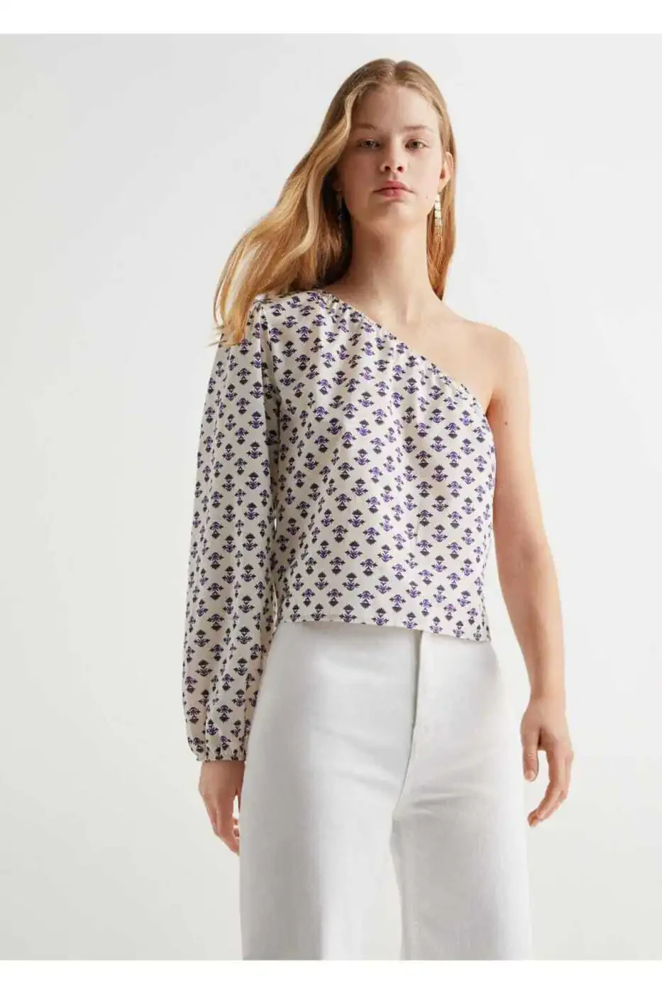 Desenli Nosimmetrik Bluzka, 100% paxta, bitta qo'lli dizayn, nosimmetrik siluet, assimetrik yoqa, tul mato, parvarish oson
