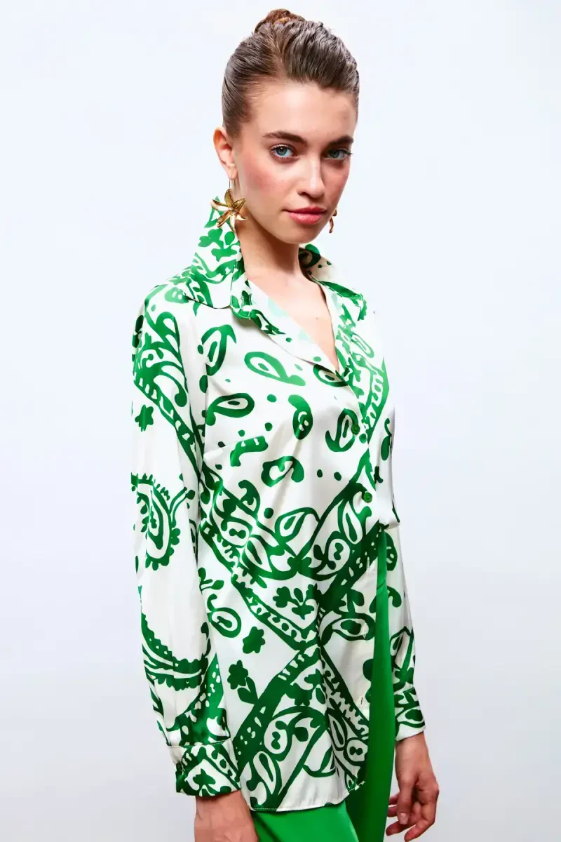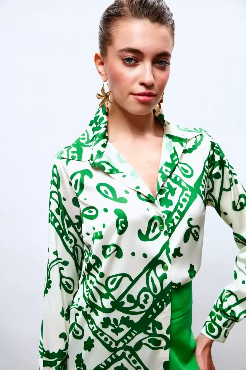 Naqshli Bo'shashgan Saten Ko'ylak kundalik hayotdan maxsus tadbirlarga qadar har qanday vaqtda zamonaviy ko'rinish istagan ayollar uchun ideal tanlovdir. Klassik jinsi shim bilan birlashtirib, kundalik nafislikka erishishingiz, yubka bilan birlashtirib, ayolona ko'rinish yaratishingiz yoki kostyum bilan to'ldirib, biznesda o'ziga xos uslub yaratishingiz mumkin.