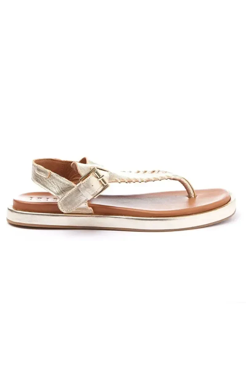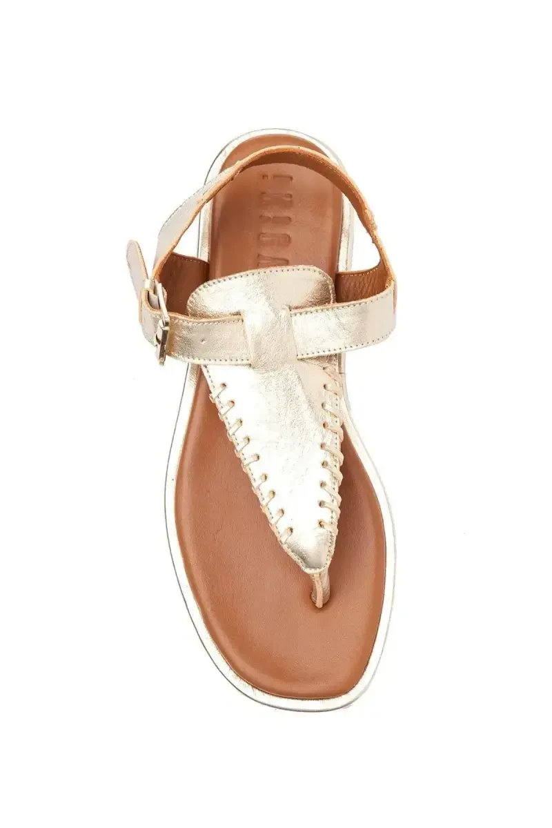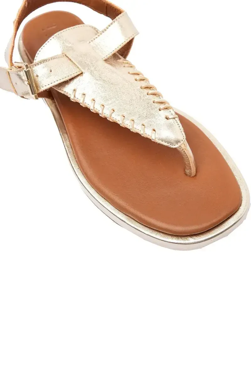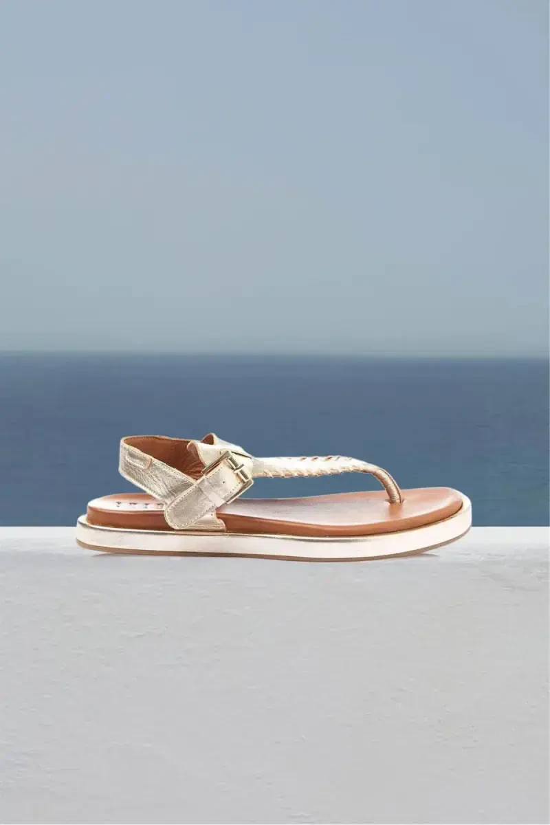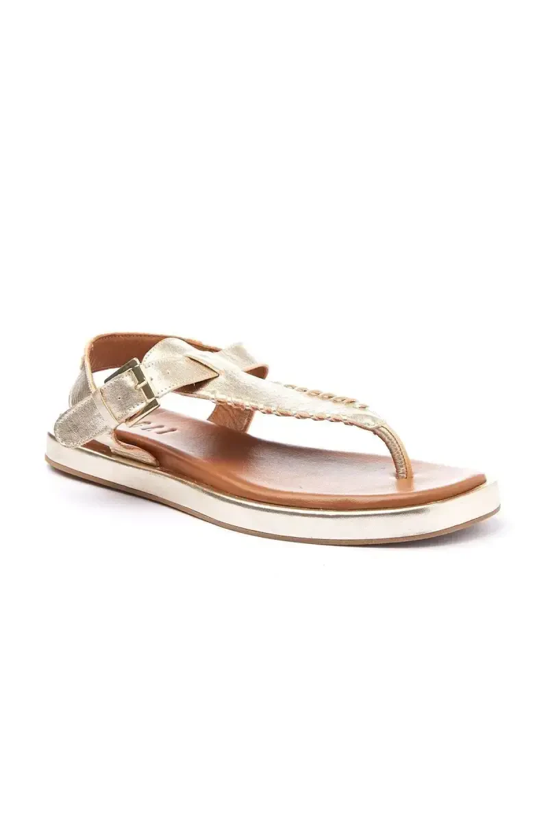 Верх из мягкой и дышащей натуральной кожи обеспечивает вашим ногам прохладу и сухость в течение всего дня. Дизайн с перемычкой обеспечивает удобную посадку и поддерживает естественное движение ваших ног. Ремешок на щиколотке с золотистой пряжкой добавляет элегантности вашему образу.