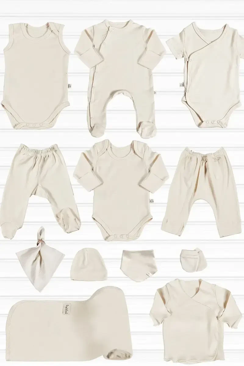 Natural 12 Piece 100% Cotton Newborn Baby Hospital Outfit Set Organic Cotton Unisex-NaturalDesigned specifically for babies' sensitive skin, the Natural 12-Piece Hospital Starter Set is a candidate to be the first outfit for your little ones with its 100% organic cotton content. Produced with your newborn baby's comfort and health in mind, this set does not irritate your baby's skin thanks to its soft texture and minimizes the risk of allergies. Its unisex design with natural color tones, suitable for both girls and boys, offers a modern and stylish look.The Natural Hospital Starter Set includes all the essential pieces your baby will need in the first days. Pieces such as a bodysuit, romper, hat, gloves, bib, inner bodysuit, and blanket keep your baby's body temperature balanced, preventing them from getting cold or sweating. The breathable structure of organic cotton allows your baby's skin to breathe, helping to prevent diaper rash.Our product does not contain any chemicals that could harm your baby's health. It is produced using GOTS (Global Organic Textile Standard) certified organic cotton. In this way, you can be sure that every piece that touches your baby's skin is safe. In addition, all parts of the set are easily washable and ironable, making life easier for mothers.The Natural 12-Piece Hospital Starter Set not only meets your baby's needs, but also offers a stylish and useful gift option. By gifting this special set to your loved ones who have just become mothers, you can make their lives easier and contribute to their babies' comfort.Choose the Natural 12 Piece 100% Cotton Newborn Baby Hospital Outfit Set Organic Cotton Unisex-Natural to provide the best care for your baby's sensitive skin and support their healthy development. Remember, your baby's first clothes are of great importance for their health and comfort.