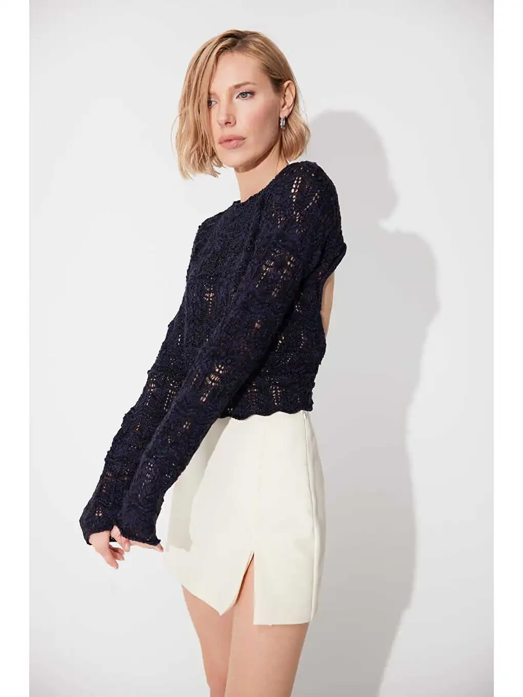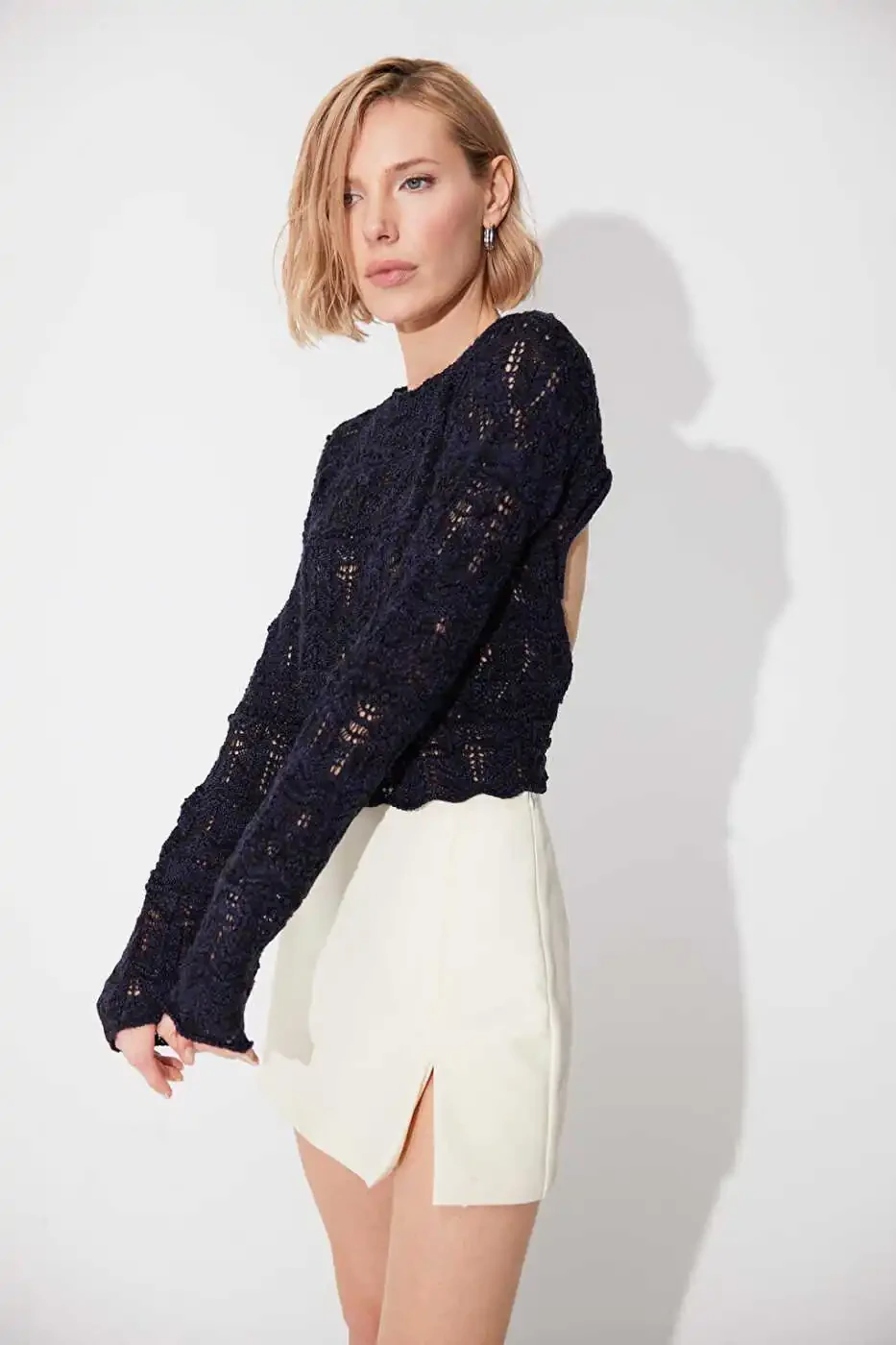 Combining style and comfort, the navy blue backless crew neck knit sweater will be an indispensable part of your wardrobe. Its soft texture and comfortable fit provide comfort all day long, while the backless design adds a feminine touch.