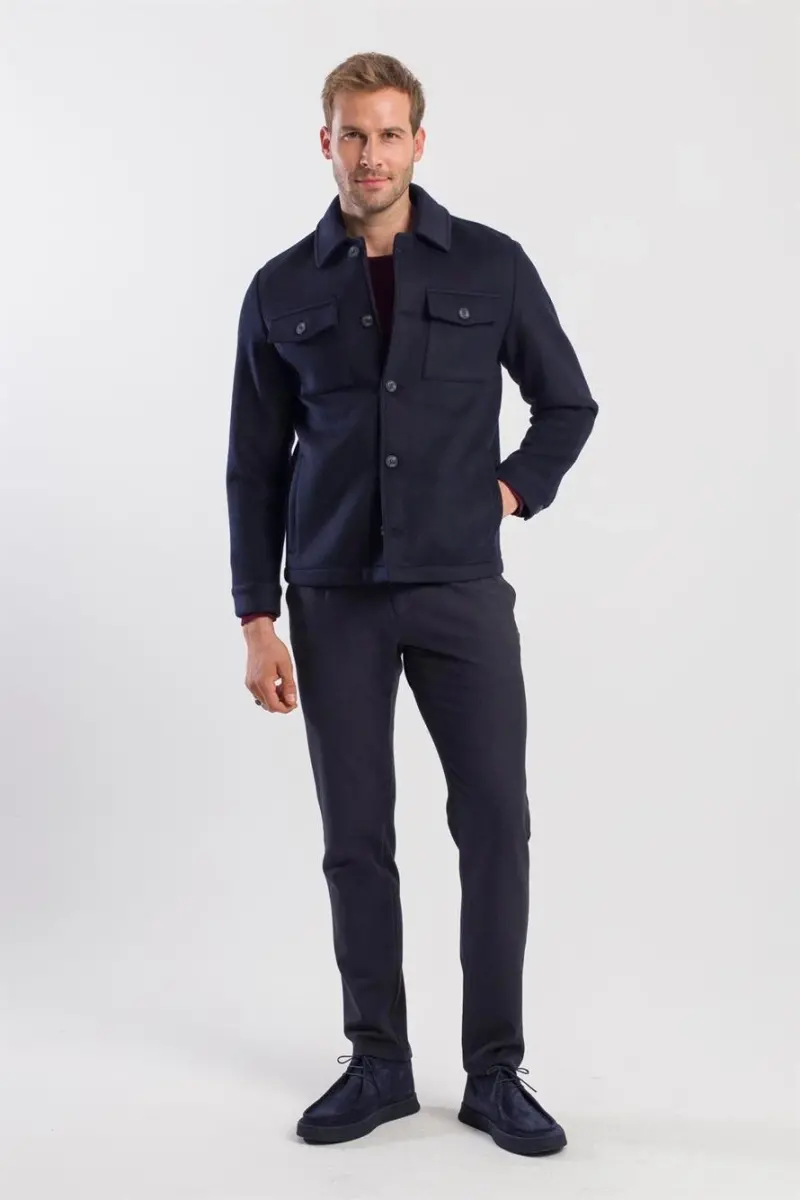 Get ready to turn heads with your sophisticated and comfortable style. The Navy Comfort Fit Baby Collar Woolen Coat is made from a premium blend of %68 POLYESTER (POLYESTER), %26 VISCOSE (VISCOSE), and %6 ELASTANE (ELASTANE). This high-quality fabric provides both comfort and warmth, while its elegant design will make you stand out from the crowd. The coat's cozy baby collar will keep your neck warm and snug on chilly days. Its roomy pockets are perfect for keeping your essentials safe and secure. Our model, who is 186 cm tall with a 96 cm chest and an 80 cm waist, is wearing a size 50 coat. Elevate your style with this stylish and comfortable coat.