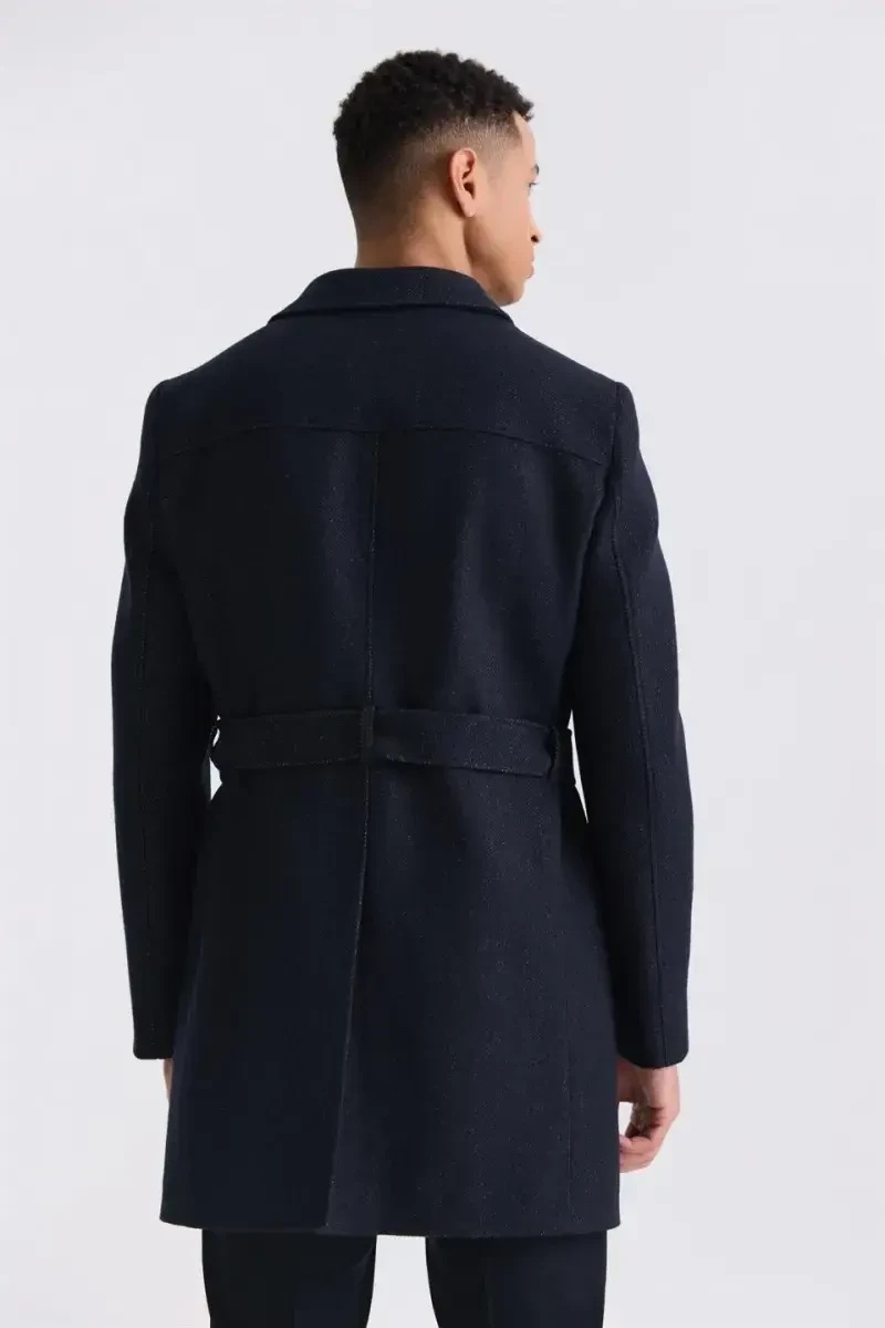 Elevate your style and comfort with the **Dark Navy Comfort Fit Notched Collar Herringbone Belted Wool Coat**. This chic and contemporary coat is crafted from a soft and durable fabric composed of 51% polyester, 24% viscose, 22% wool, and 3% elastane. The herringbone pattern adds a timeless appeal, while the belted detail provides an elegant touch.**Features:*** Material: 51% polyester, 24% viscose, 22% wool, 3% elastane* Pattern: Herringbone* Collar: Notched* Belt: Yes* Color: Dark navy**Measurements:*** Model Measurements: * Height: 187 cm * Weight: 78 kg * Shoulder: 120 cm * Chest: 100 cm* Model Size: 50With its blend of 51% polyester, 24% viscose, 22% wool, and 3% elastane, this coat is breathable, comfortable, and durable. The notched collar keeps you warm in chilly weather, while the belt detail adds a touch of sophistication. The timeless herringbone pattern gives this coat versatility, making it perfect to pair with almost any outfit.Stay stylish and comfortable in all occasions, from work to nightlife, with this **Dark Navy Comfort Fit Notched Collar Herringbone Belted Wool Coat**.