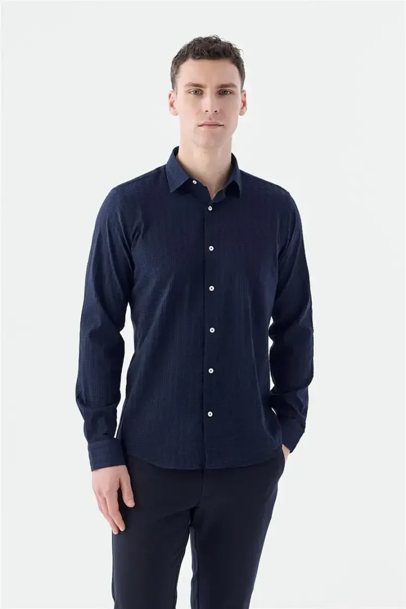 Meet our Navy Blue Comfort Fit Patterned Stretchy Cotton Sports Shirt, designed to keep you comfortable and stylish all day long! Its special fabric blend of 70% cotton, 26% polyester, and 4% lycra offers breathability and softness. Its stretchy fabric allows for comfortable movement throughout the day, preventing shrinkage and discomfort. With its sporty style, this shirt will become an indispensable part of your everyday outfits, adding a modern touch to your style with its navy blue color and stylish pattern. Whether in business, sports activities, or everyday life; it's a stylish and comfortable choice that will make you feel good in any environment. As you can see in the image on the mannequin, it provides a perfect fit. Our product can be machine washed at 30 degrees, but we recommend not using bleach or a dryer. When ironing, it is recommended to iron it inside out and at low heat. For more detailed care instructions, please check the product label. Please refer to the size chart to select the correct size. This high-quality and stylish sports shirt is sure to become a new favorite in your wardrobe!