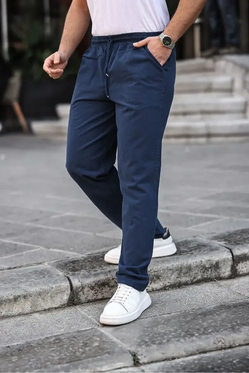 The Navy Blue Men's Summer Linen Blend Relaxed Pants, perfect for men seeking style and comfort in hot summer days, will be an indispensable part of your wardrobe. Made from a natural blend of linen and cotton, these pants keep you cool and comfortable all day long with their breathable structure.
