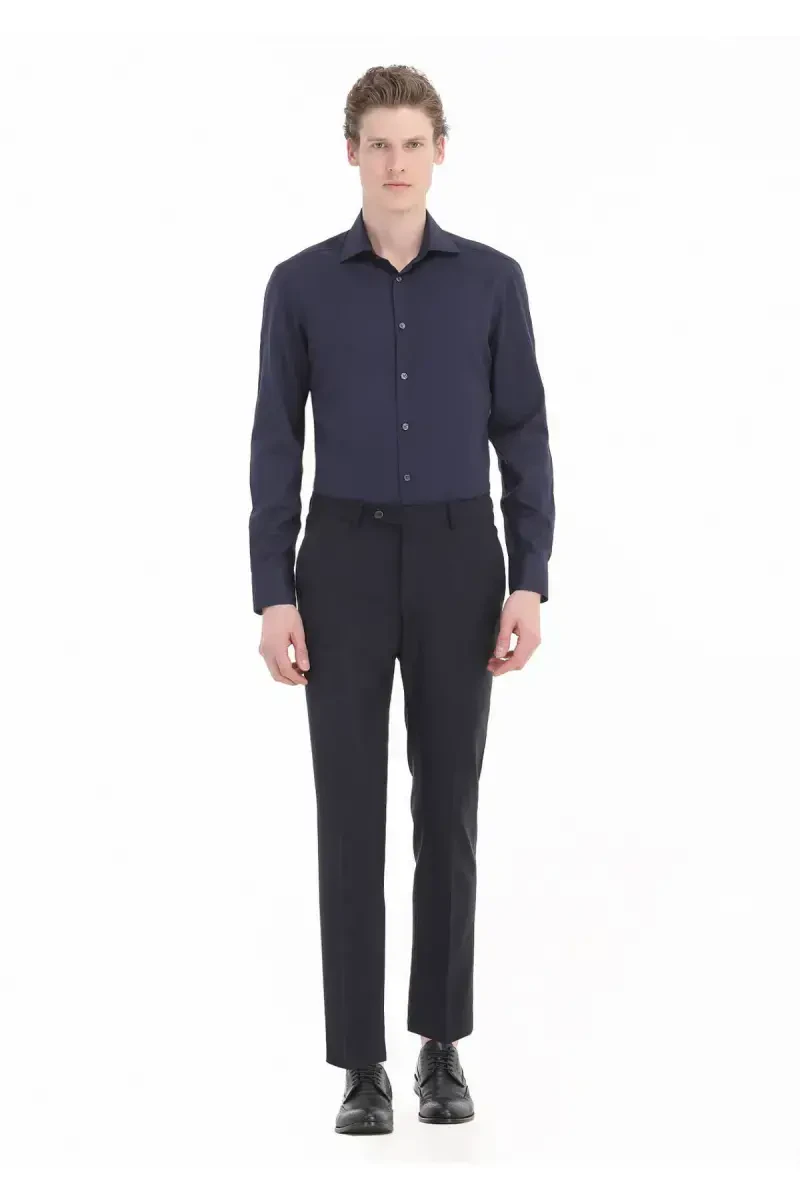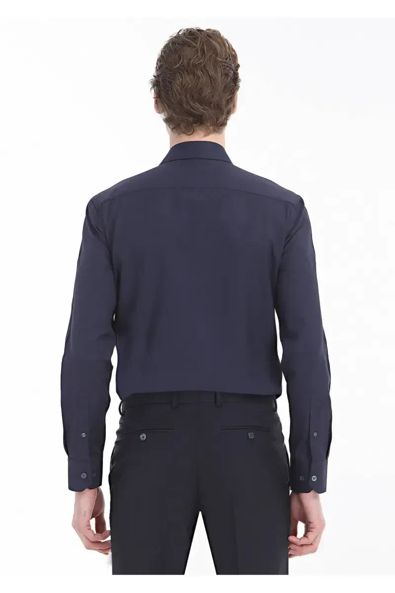 Designed for modern men seeking timeless elegance and comfort, the Navy Blue Solid Regular Fit Woven Classic Cotton Blend Shirt is set to become a staple in your wardrobe. With its deep navy blue tone, this shirt offers a classic and sophisticated look, while its special woven fabric, made from a blend of 60% cotton and 40% polyester, is both breathable and durable. It provides a comfortable wearing experience throughout the day without compromising your style. The regular fit cut, unlike tight-fitting molds that hug your body, provides a comfortable fit without restricting your freedom of movement and adapts to different body types. This allows you to comfortably wear it both in daily life and on special occasions. The classic collar design adds a traditional elegance to the shirt, making you feel confident and stylish in any setting, from formal invitations to job interviews, from daily meetings to special events. Combining the elegance of navy blue with a modern cut, this shirt pairs perfectly with jeans, chinos, and even dress pants. You can achieve a casual chic look by combining it with sneakers, or create a more formal style by complementing it with classic shoes. Thanks to its durable woven fabric, meticulous stitching, and quality material, it will take its place at the forefront of your wardrobe for many years. Its wrinkle-resistant feature also ensures that you always have a flawless look. This shirt is a perfect choice for men who seek both elegance and comfort without compromising their style.