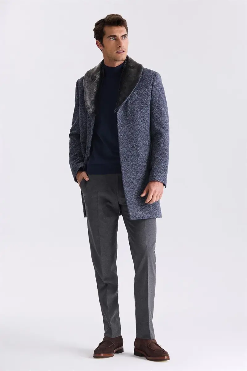 **Navy Blue Regular Fit Zip-out Fur Collar Patterned Wool Coat**