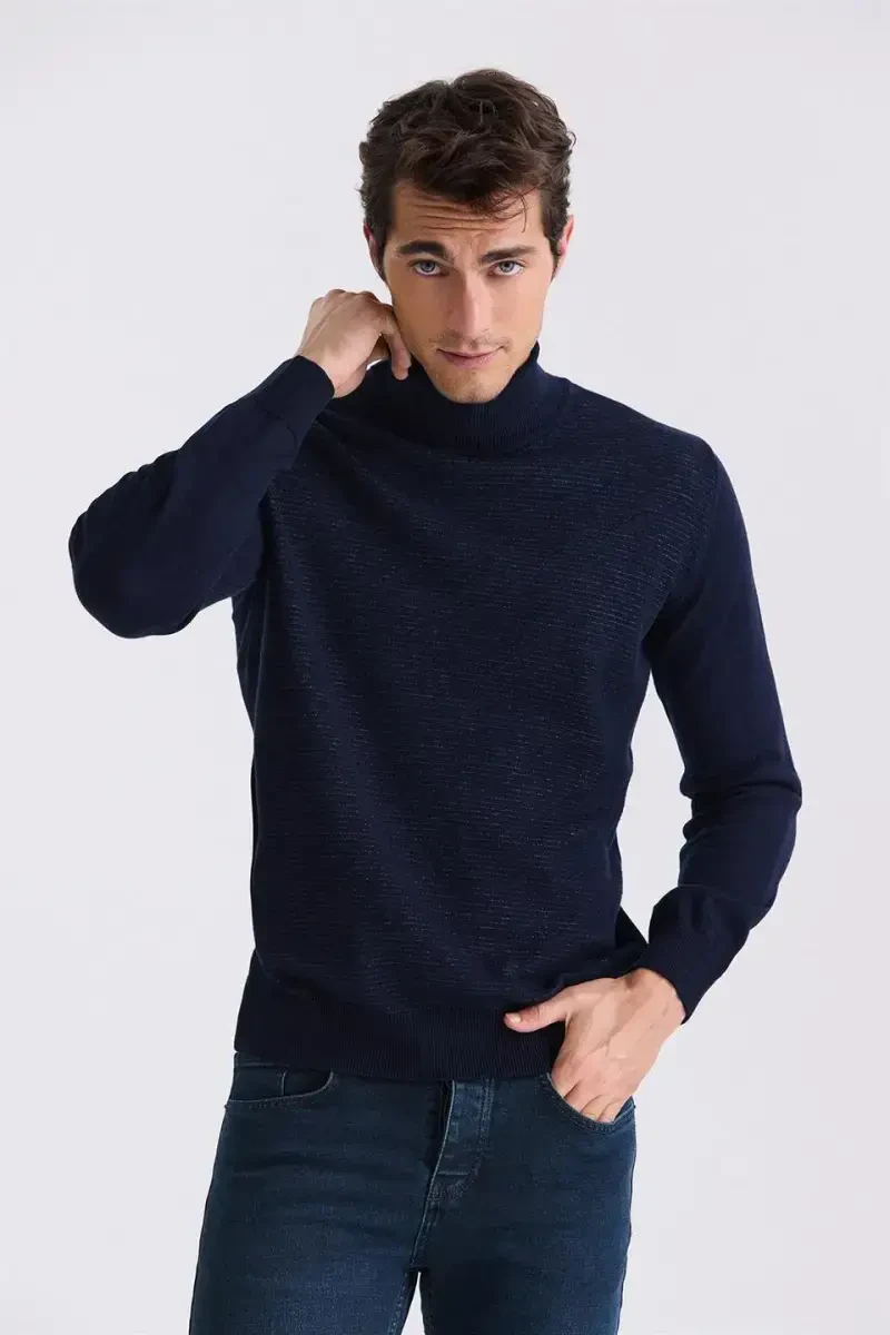 Introducing the Navy Blue Slim Fit Full Fisherman Neck Tricot Sweater, a stylish and comfortable addition to your wardrobe. Crafted from a luxurious blend of 50% cotton and 50% acrylic, this sweater is incredibly soft to the touch. Its relaxed fit and slim silhouette will flatter your figure, while the full fisherman neck design provides ample warmth and coziness for those chilly days.