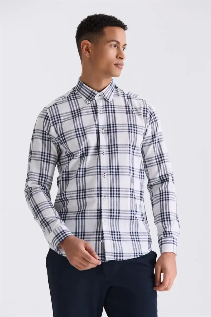**Navy Blue Slim Fit Plaid 100% Cotton Shirt**