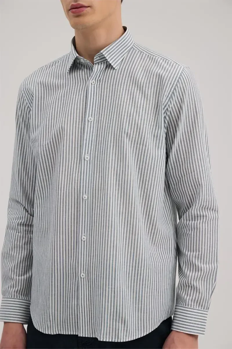 Experience elegance and comfort together with the Navy Comfort Fit Linen Blend Striped Shirt. This shirt is a perfect option to accompany you in both your daily use and special moments. Thanks to its linen and cotton blend fabric, it allows your skin to breathe, prevents sweating, and ensures you feel comfortable all day long. The comfort fit cut fits you perfectly without restricting your freedom of movement, creating a stylish silhouette. The navy color and elegant striped pattern can be easily combined with any style of clothing. The button-down collar adds a classic touch to the shirt, while allowing you to make different combinations. Whether you attend a special event with stylish pants or spend a relaxing weekend with casual jeans, this shirt will complement your style in any environment. Thanks to its high-quality material and careful workmanship, it offers long-lasting use. The Navy Comfort Fit Linen Blend Striped Shirt, which will be one of the indispensable pieces of your wardrobe, allows you to reflect your style and guarantees your comfort throughout the day. The M size on the model can give you an idea of how the product will look on you. By choosing the one that suits your size, you can achieve a perfect fit. Combining elegance and comfort, this shirt is one of the basic pieces that should be in every man's wardrobe. Choose the Navy Comfort Fit Linen Blend Striped Shirt to feel special and let your style speak. Feel good all day long with the natural texture of linen and the softness of cotton.