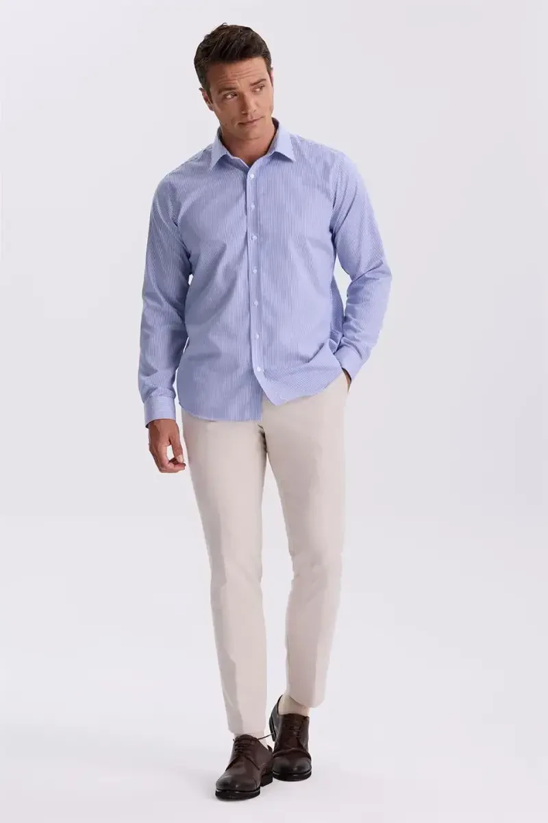 Experience elegance and comfort all day long with the Navy Comfort Fit Non-Iron 100% Cotton Striped Non-Iron Shirt. Designed specifically for men who want to look flawless at all times, without the hassle of ironing, whether during a busy work schedule or on special occasions. This shirt allows your skin to breathe thanks to its 100% cotton texture and offers comfortable use throughout the day. The comfort fit cut allows you to move comfortably without constricting your body, so you can move freely throughout the day. The striped pattern adds a modern and dynamic touch to the shirt, allowing you to create different combinations. You can combine it with a suit for a classic look, or with jeans for a more casual style. Thanks to its Non-Iron feature, you don't have to deal with wrinkles after washing. Simply hang the shirt after washing. This feature provides great convenience, especially for those who travel or have a busy lifestyle. Navy blue is a timeless option that adapts to any environment. It completes your elegance both in business life and in daily use. The fabric of the shirt is long-lasting and resistant to repeated washing as it is made of high-quality cotton. The M size measurements of the product are as stated in the size chart. It is recommended that you consider the measurements in the table when determining your own size. Considering the mannequin's measurements (Height: 189 Cm, Chest: 100 Cm, Waist: 92 Cm), you can better estimate how the shirt will look on you. The Navy Comfort Fit Non-Iron 100% Cotton Striped Non-Iron Shirt will be an indispensable part of your wardrobe. Offering both comfort and elegance, this shirt is a basic clothing item that every man should have. This shirt, which you can give as a gift to yourself or your loved ones, is a high-quality and useful option.