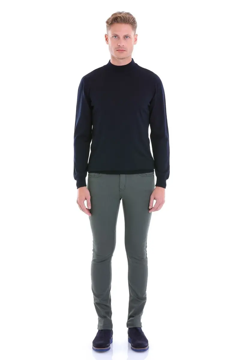 Navy Comfort Fit Plain Half Turtleneck Woolen Wool Sweater, a candidate to be one of the indispensable pieces of your wardrobe, bringing together elegance and comfort. It keeps you warm in cold weather while ensuring you don't compromise on your modern and elegant look. Thanks to its high-quality wool content, it offers a soft touch and allows for long-lasting use. The comfort fit cut allows you to move comfortably throughout the day, while the half-turtleneck detail adds a sophisticated touch to your elegance.Product DescriptionNavy Comfort Fit Plain Half Turtleneck Woolen Wool Sweater is a candidate to be the indispensable savior of cold weather. Thanks to its high-quality wool blend, it allows you to feel warm and comfortable throughout the day. The classic navy color easily adapts to any style, while the half-turtleneck detail adds a modern touch to your elegance. Thanks to its comfort fit cut, it offers a comfortable use without squeezing your body. This sweater, which you can prefer in your daily combinations or in your more special moments, will be one of the most loved pieces of your wardrobe. Its woolen structure prevents sweating with its breathable feature and protects perfectly from the cold. Its plain pattern allows it to be easily combined with different trousers and skirts. It is an ideal choice for men who want to achieve both a stylish and comfortable look. This sweater is not just a garment, but also a style statement. It is an investment that you can use for many years thanks to its high-quality material selection and careful workmanship. It is an excellent option for those who do not want to compromise on their style in winter months. The nobility of navy blue and the warmth of the woolen texture come together to offer you a unique experience. You can easily prefer this sweater in the office, on weekend trips or at special invitations, and it will highlight your elegance in any environment. It is a timeless piece that should definitely be in your wardrobe. Remember, the right sweater choice can change your entire look. Take your style to the next level with the Navy Comfort Fit Plain Half Turtleneck Woolen Wool Sweater and always look stylish and well-groomed.Product Features* High quality wool blend* Comfort fit cut* Half turtleneck* Classic navy color* Long lasting use* Breathable structure* Plain pattern* Keeps you warm in cold weather* Suitable for daily and special occasions* Suitable for different combinationsAdditional InformationIt is recommended to wash the product according to the washing instructions for long-lasting use. Dry cleaning can be preferred or hand washing can be done. Do not use bleach. Iron on low heat. Lay flat to dry. The content of the product is stated on the label. Color tone may vary depending on your screen settings. Size on the model: M.
