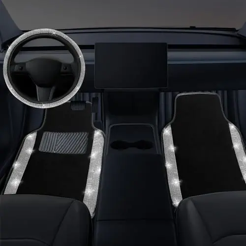 Wide Compatibility: Package Includes 2pcs front mats, 2pcs rear mats and 1pc steering wheel cover, fits 95% cars, sedans, SUV and trucks. The back of the car mats are Non-Slip design, won't slide, keep your safety while driving. Luxury Rhinestone Design: The surface is designed with premium sparkly rhinestones, which is a perfect car decoration, refresh your car, make it more fashionable and luxurious. Made of High Quality Carpet: prevent your car floor from dirt, grit and scratch for long time. Waterproof, can be easily cleand with water. Universal Size: Designed in universal size, suitable for most cars. Easy installation: Humanized design, just place them to the corresponding position and you will own a stylish & charming car interior.