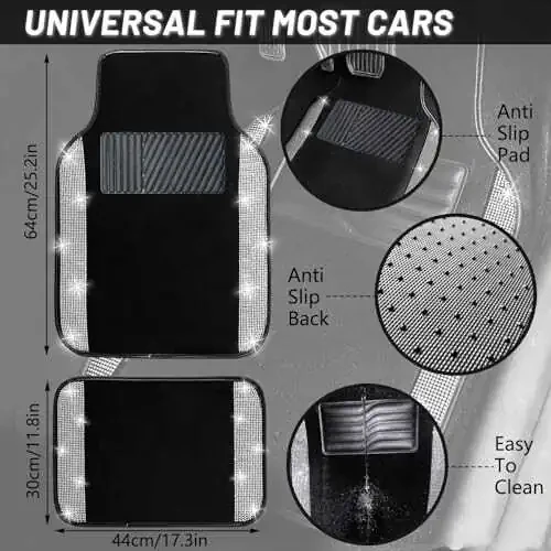 Want to add some glamour and elegance to your car? NBTEPEM Bling Car Floor Mats will give your car interior a dazzling look. Its diamond patterned sparkling surface creates a stunning effect with every glance. Universal fit for most cars, SUVs and trucks.
