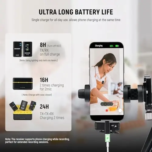 - 656ft/200m Sabit İletim: Engellenmemiş alanlarda, bu mini kablosuz yaka mikrofonu seti, kararlı ses kaydı ve parazite karşı daha yüksek direnç için 656ft (200m) sorunsuz kablosuz iletim sağlar. Not: İletim aralığı konumlara göre değişir.
