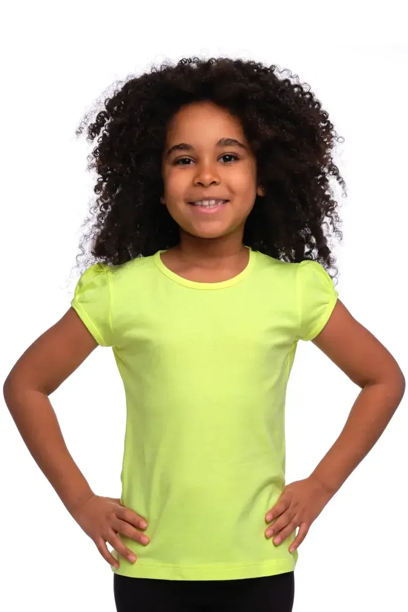 Neon yellow t-shirt, girl's t-shirt, crew neck t-shirt, puff sleeve t-shirt, basic t-shirt, cotton t-shirt, children's clothing, girl's fashion, summer t-shirt, comfortable t-shirt