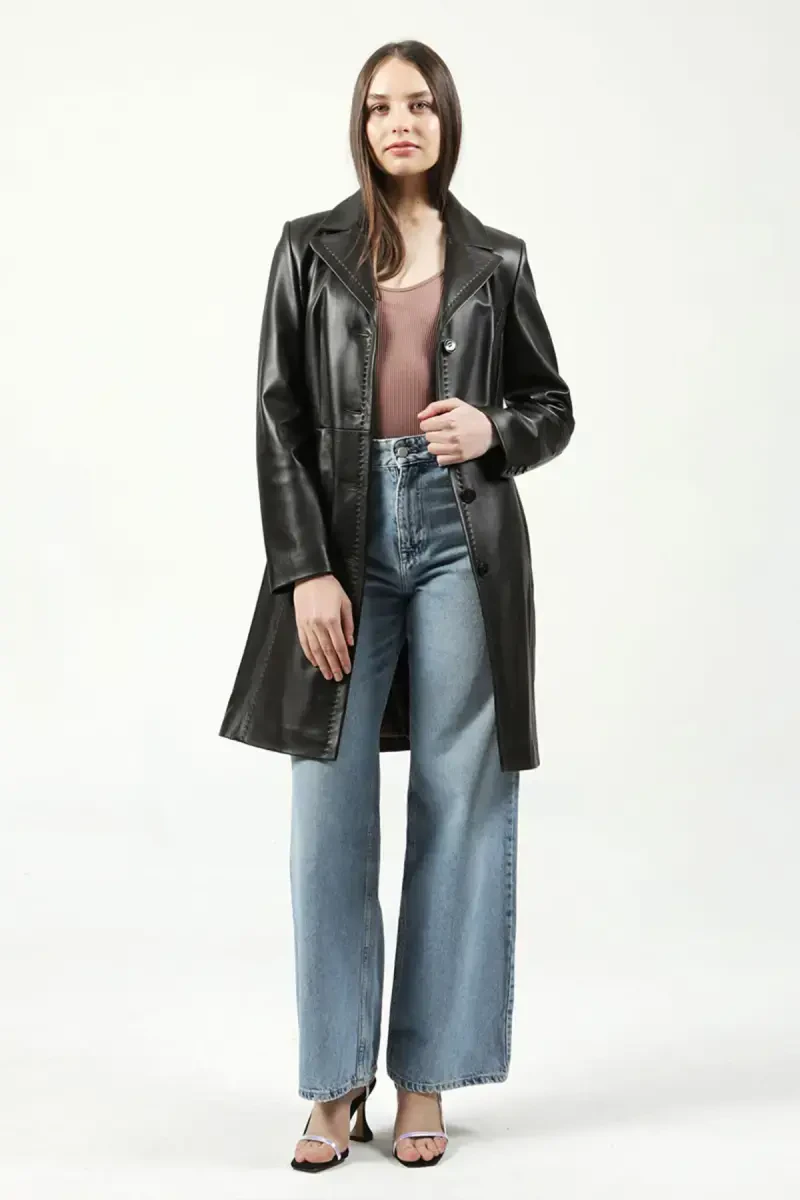 Neri Genuine Leather Women's Coat Brown is an indispensable piece of outerwear that combines elegance and comfort. Offered with DERİCLUB assurance, this coat is a product of a quarter-century of experience and is made of genuine lambskin. Thanks to its slim fit, it provides a stylish look with its form-fitting cut, while offering all-day comfort thanks to the soft and first-class genuine leather used. The high-quality polyester-satin lining used inside provides a comfortable wearing experience by preventing sweating as well as keeping you warm. This knee-length leather coat model, which attracts attention with its jacket collar model and wide stitching feature, easily adapts to any style. The slit detail on the back hem does not restrict your freedom of movement and adds a modern touch to the coat. Neri Genuine Leather Women's Coat is an ideal choice for both daily use and special occasions. Its brown color allows you to create different combinations, while its high-quality material and workmanship will make it a favorite piece in your wardrobe for many years. Don't forget to check the size chart when placing your order. The product in the image is "M" size and the materials and accessories used on the product may vary. This coat will be the choice of both women who want to be stylish and those who value quality. Make a difference in any environment with the Neri Genuine Leather Women's Coat, which offers elegance, comfort and durability together.