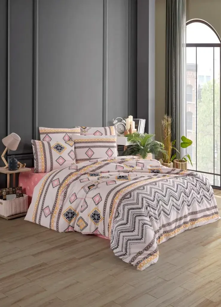 %100 Paxta Ranforce Mato. Nevresim: 200x220 sm. Choyshab: 240x260 sm. Yostiq Jildi: 50x70 sm (2 dona). OEKO-TEX® Standard 100 sertifikatiga ega.