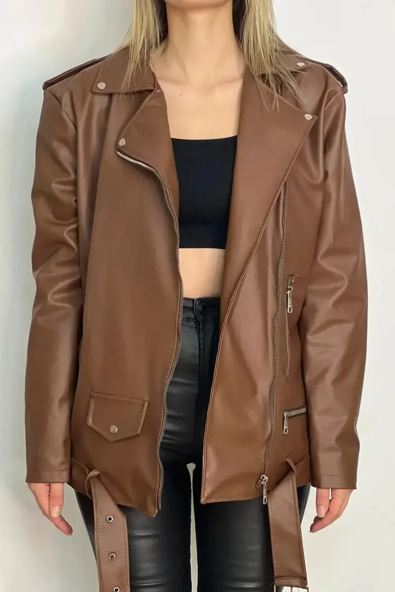 The New Season Oversize Long Women's Brown Leather Jacket is a special design that combines elegance and comfort. This jacket is a timeless piece that every woman of all ages should have in her wardrobe. Its brown color complements any combination and completes your style. Thanks to its lined structure, it offers comfortable use all day long, while its oversize cut does not restrict your freedom of movement. The product is offered with JaglionTR assurance and is produced in limited quantities. Hurry up so you don't miss out on this special design jacket!Ideal for daily use, this leather jacket not only looks stylish, but also stands out with its functional features. Thanks to its waterproof feature, it protects you even in rainy weather, so you can spend time outdoors without compromising your style. Its long sleeves and medium-thick material provide an ideal temperature balance during seasonal transitions.This jacket is also an excellent choice for those who embrace sustainable fashion. The use of organic cotton supports an environmentally friendly production process. At the same time, its durability is increased and its breathability is maintained thanks to Gore-Tex technology. The woven fabric type is ideal for long-term use and preserves the jacket's shape. The trendy plain pattern offers a modern and timeless look.The double-pocket structure offers a practical solution for carrying your daily belongings with you, while the belt details add a feminine touch and adapt to your body lines. The oversize model appeals to a wide range of sizes and is suitable for all body types. Being a part of the Design collection, this jacket will have a special place in the wardrobe of stylish women. When cared for according to the Type4 washing instructions, it offers long-lasting use. This jacket is an indispensable option for women who want both elegance and comfort. Choose the New Season Oversize Long Women's Brown Leather Jacket to achieve a striking look in any environment.