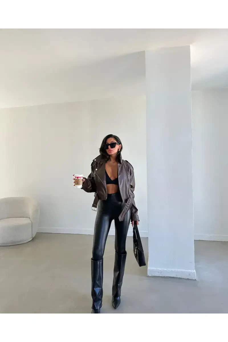 New Season Oversize Women's Bitter Coffee Biker Leather Jacket is a candidate to be an indispensable part of your wardrobe! Combining elegance and comfort, this jacket will add a different touch to all your combinations. Thanks to its oversize cut, it allows you to achieve both a modern and free look. The bitter coffee color reflects the trend tones of autumn and winter, while easily adapting to every style. The high-quality leather material offers long-lasting use and makes a difference with its texture. Biker details add a dynamic and bold touch to the jacket, while highlighting your feminine silhouette. This jacket, which you can choose for daily use as well as for your special occasions, will take your style to the next level. Thanks to its inner lining, it keeps you warm in cold weather and offers all-day comfort with its non-sweating structure. This jacket, which is suitable for every body type with its different size options, is ready to be the most loved piece of your wardrobe. Metal zipper and snap details complement the jacket's elegance, while its useful pockets provide practicality. This jacket, which you can easily use in both sports and classic combinations, allows you to attract attention in any environment. The warmth of the bitter coffee color and the cool stance of the biker model will add originality to your style. With this jacket, enjoy being stylish without sacrificing your comfort, and make a difference with your style in every environment you enter. Whether you create a casual style by combining it with jeans, or get ready for the night by combining it with a stylish dress. The New Season Oversize Women's Bitter Coffee Biker Leather Jacket will accompany you in every situation.