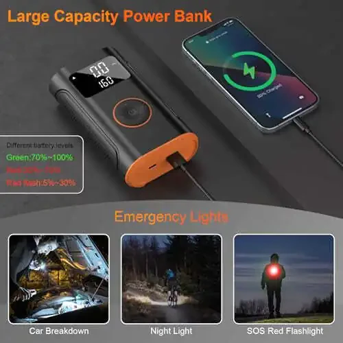 (New Upgrade) ZSX Portable Air Compressor is a multifunctional device designed to make your life easier. It meets a wide range of inflation needs, from car tires to bicycle tires, from swimming rings to sports balls. With its advanced features and user-friendly design, it is a must-have tool for emergencies. Thanks to the memory function, you can save your preferred pressure settings and avoid manual adjustments every time. The fast inflation feature saves time by reaching a maximum pressure of 160 PSI thanks to its powerful motor. Its dual-screen display accurately shows both preset and current pressure. The built-in power bank and emergency lights help you in unexpected situations. The ZSX Portable Air Compressor is easy to carry and store thanks to its compact design. Coming with multiple adapters, the product is compatible with various valve types. Its durable construction ensures long-lasting use. It is a handy tool to keep in your car, garage or home. It is a perfect gift option for special occasions such as Father's Day, Mother's Day, Christmas and Halloween.