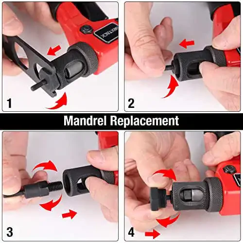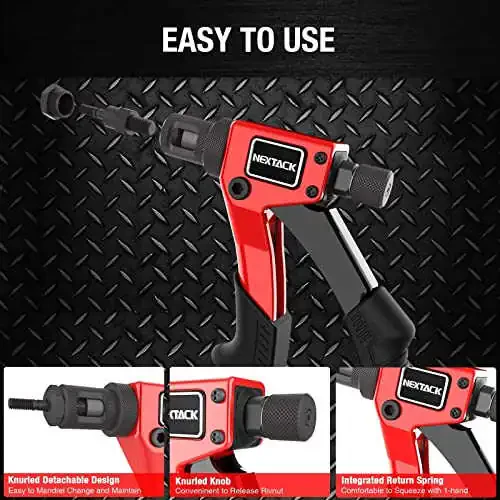【Compact Design for Tight Space】The 8 inch right angle style make it easy for grab-and-go to solve out-of-reach riveting projects for confined narrow spots. it is an ideal solution for SMALL ALUMINIUM rivnut, and it will need some grip strength for bigger inserts 1/4 & M6. 【One-Stop-Solution】The nutsert tool kit is packed in a well-organized compartmented case for safe storage and convenient portability. It comes with a step drill bit, 8 universal interchangeable mandrels, 80 carbon steel threaded nuts (10 for each mandrel), & a professional user manual, and the pitch of M3 is 0.5mm, M4 0.7mm, M5 0.8mm, M6 1mm. 【Built to Last】The threaded insert hand riveter consists of quality steel arm with blacken and heating treatment, aluminum alloy body, and thick non-slip PVC grips. It prevents from corrosion and deformation and prolongs the lifecycle to ensure the strength, durablity and reliablity. 【Easy to Change Mandrels】The nutsert rivet gun features modular detachable design for easy riveting, mandrels changing and maintenance, rotary knob structure for easy nut loading and releasing. Perfect solution for DIY and Professional use. 【Versatile Application】The threaded insert riveter tool kit can help you add attachedment with bolt on working piece like metal, fiberglass in different occasion like van wall, metalworking, railway, aviation, bicycle, off-road, RV and home modification. 【Warm Tips】Please note the mandrels are consumable and may be damaged with uneven pressure and improper use. We have addtional replacement mandrels M3 M4 M5 M6 6-32 8-32 10-24 10-32 1/4-20 here in our store. If any issue during using please message us.