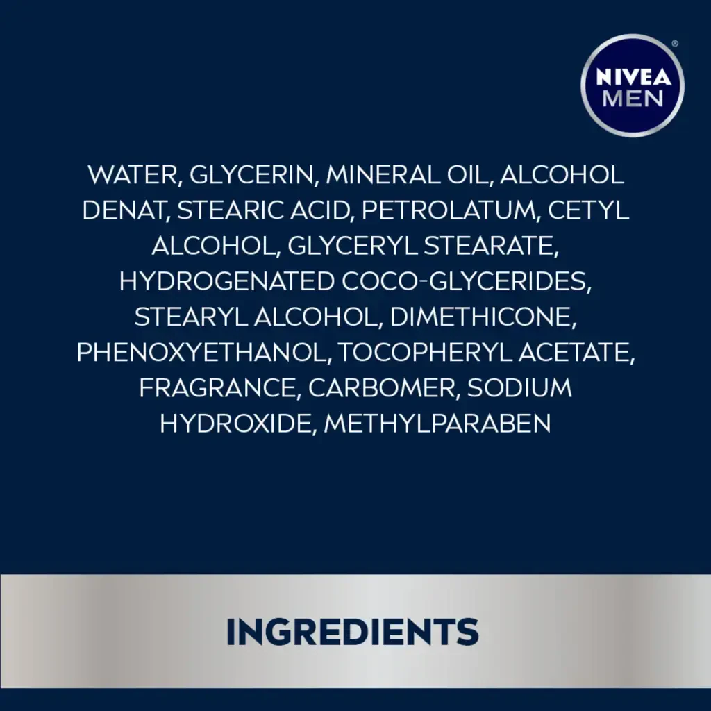 NIVEA MEN Creme is dermatologically tested. Suitable for all skin types. Store in a cool and dry place. Avoid contact with eyes. In case of contact, rinse with plenty of water. Keep out of reach of children.
