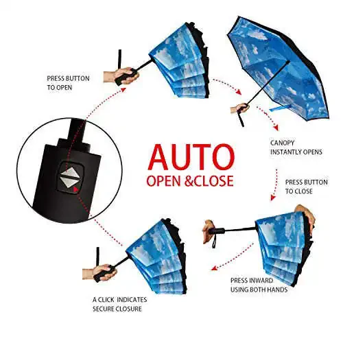 - Reverse Opening and Closing: With its reverse opening and closing feature, you can fold the umbrella with the wet side out, put it in your car or bag, and eliminate the wetness problem.