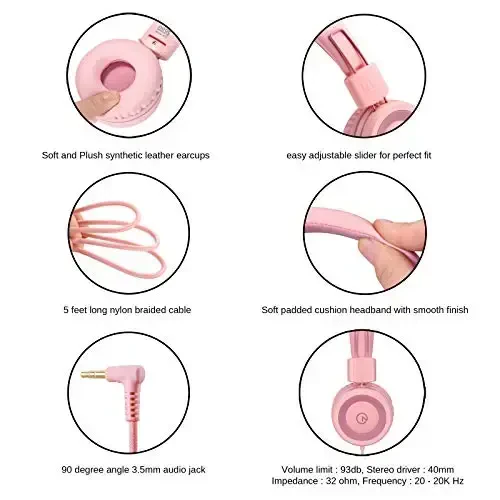 noot products Kids Headphones K11 Foldable Stereo Tangle-Free 5ft Long Cord 3.5mm Jack Plug in Wired On-Ear Headset for iPad/Girls/Boys/School/Laptop/Travel/Plane/Tablet-Soft Pink