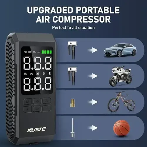 NUSTE ko'chma havo kompressori raqamli bosim o'lchagich, 150PSI quvvatlanadigan batareya, LED chiroq va simsiz dizayni bilan avtomobil, mototsikl, velosiped va boshqalar uchun ajoyib shinalarni to'ldirish yechimidir. Ushbu ko'p qirrali havo pompasi yo'lda yoki uyda shinalaringizni tez va oson to'ldirish imkonini beradi. Rivojlangan xususiyatlari va foydalanuvchilarga qulay dizayni bilan NUSTE ko'chma havo kompressori har bir avtomobil egasi uchun ajralmas aksessuardir. 5 xil to'ldirish rejimi (velosiped, mototsikl, avtomobil, to'p va maxsus sozlash) bilan har qanday shinalar va to'ldiriladigan narsalarga osongina moslashadi. Avtomatik to'xtash funktsiyasi tufayli oldindan belgilangan bosim qiymatiga yetganda nasos avtomatik ravishda to'xtaydi, bu esa ortiqcha to'ldirishni oldini oladi va xavfsizlikni ta'minlaydi. 2000mAh katta sig'imli batareyasi tufayli simsiz foydalanish erkinligini taqdim etadi va favqulodda vaziyatlarda quvvat manbai sifatida ham foydalanish mumkin. O'rnatilgan LED chiroq tufayli qorong'u muhitda ham bemalol foydalanishingiz mumkin. Yilni va ko'chma dizayni uni avtomobilingizda yoki uyingizda osongina saqlash va tashish imkonini beradi.