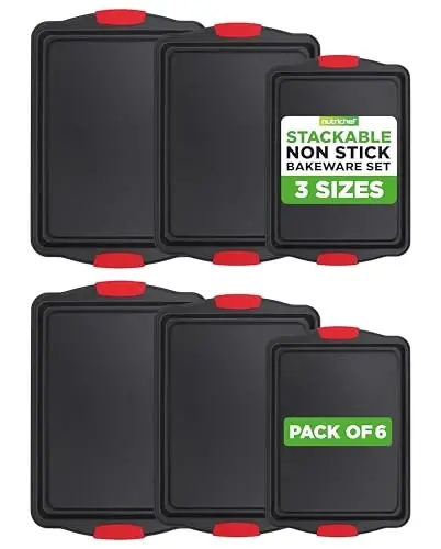 NutriChef Nonstick Baking Pans Set – Premium Cookie Sheets for Baking, Carbon Steel Stackable Baking Trays with Red Silicone Handles, Oven Safe Pans for Cookies, and Cakes, Dishwasher Safe (6 Pack)